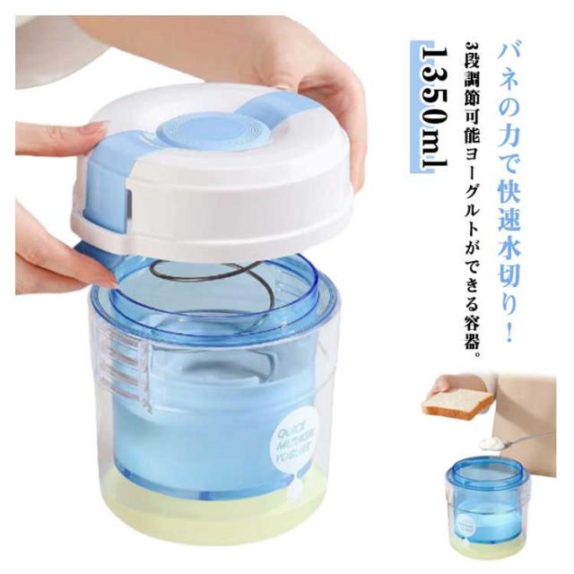 | バネの力で快速水切り!3段調節可能ヨーグルトができる容器。【1350ml】 ヨーグルトをセットして最短1時間で作れます。 ペーパーフィルタ不要で繰り返し使えます。 ゆるめにしてドレッシングやソースにしたり、かためにしてチーズのような食感を楽しんだり、時間調節でアレンジできます。 ゼラチン・寒天等が使用されているヨーグルトは水切りできません。 フタ付で臭い移りを防ぐ。 | |