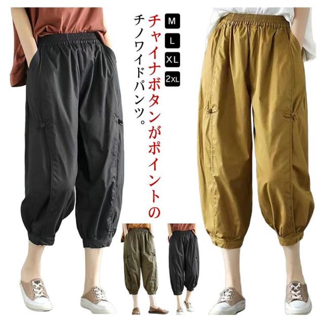 低身長 ワイドパンツ サルエルパンツ レディース ボトム 春 夏 7分丈 カーブパンツ クロップド ハイウエスト カーゴパンツ チノパンツ チャイナボタン 薄手 綿 通気性 涼しい 軽量 ゆったり 体型カバー バルーンパンツ