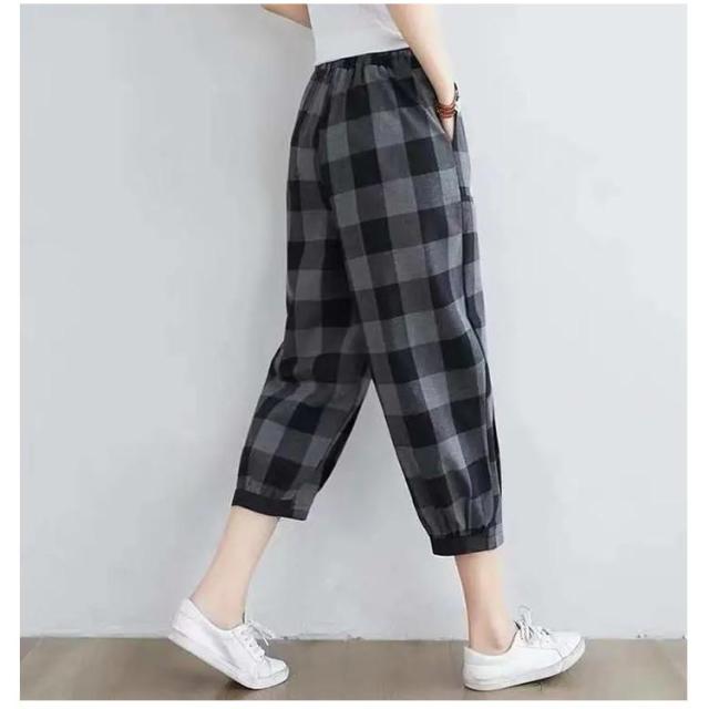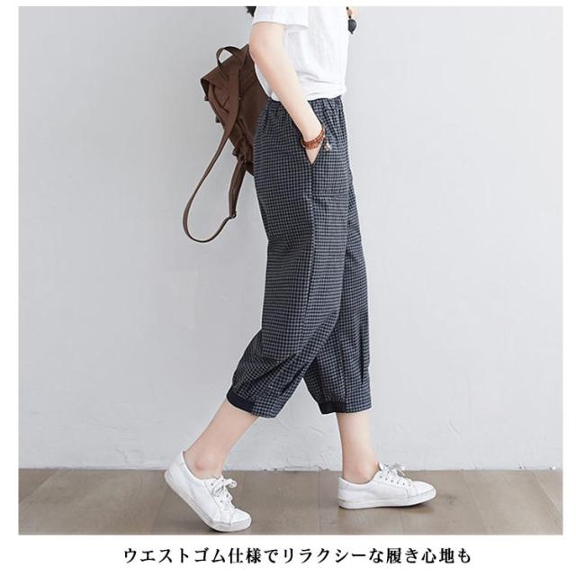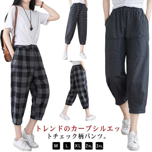 7分丈 カーブパンツ ボトム 夏 チェック柄 春 レディース カーブパンツ 軽量 クロップド 低身長 パンツ ハイウエスト 薄手 綿 通気性 涼しい サルエルパンツ ゆったり 体型カバー バルーンパンツ ゴムウエスト ポケット付き