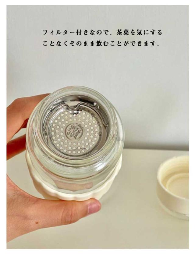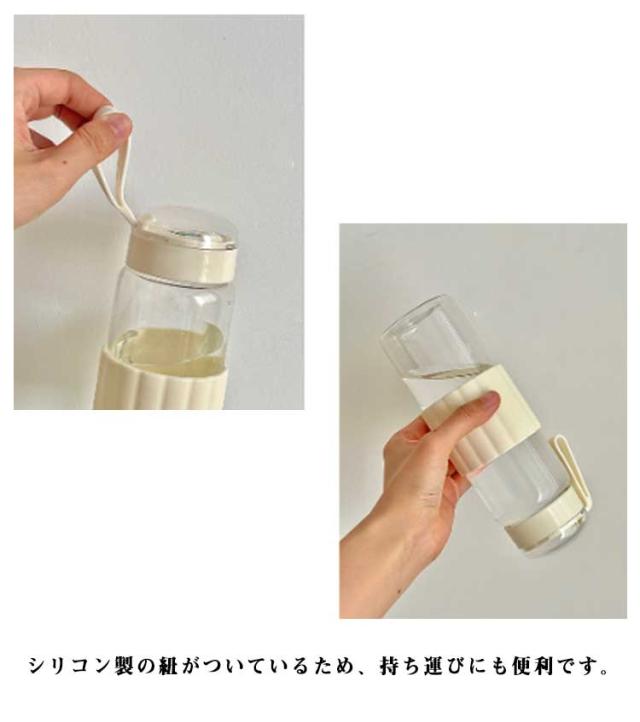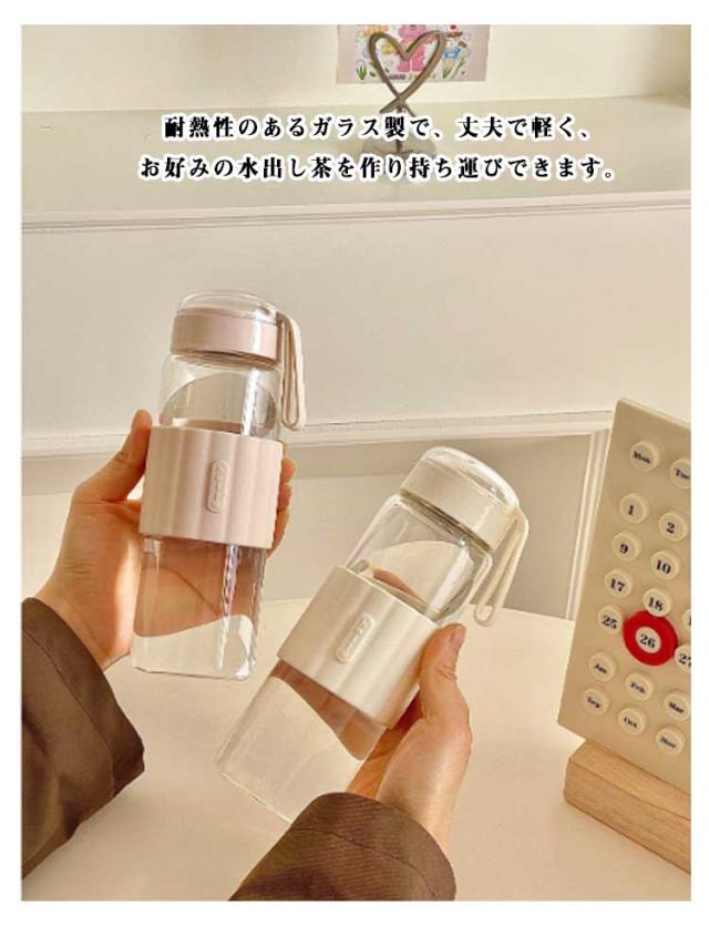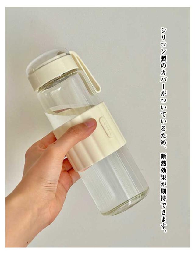 | シリコンカバー&シリコンストラップ付きウォーターボトル。【480ml】 飲み心地の良い大きさの飲み口で、氷が入れやすく洗いやすいです。 蓋は簡単に開く仕様なので散歩や通勤中など、いつでも手間を取らず快適に水分補給ができます。 シリコン製のカバーがついているため、断熱効果が期待できます。 シリコン製の紐がついているため、持ち運びにも便利です。 耐熱性のあるガラス製で、丈夫で軽く、お好みの水出し茶を作り持ち運びできます。 フィルター付きなので、茶葉を気にすることなくそのまま飲むことができます。 ドリンクを持ち運ぶだけじゃなく、いろんな便利な使い方ができるアイテムなので、アウトドアシーンやスポーツシーンをより楽しませてくれます。 | |