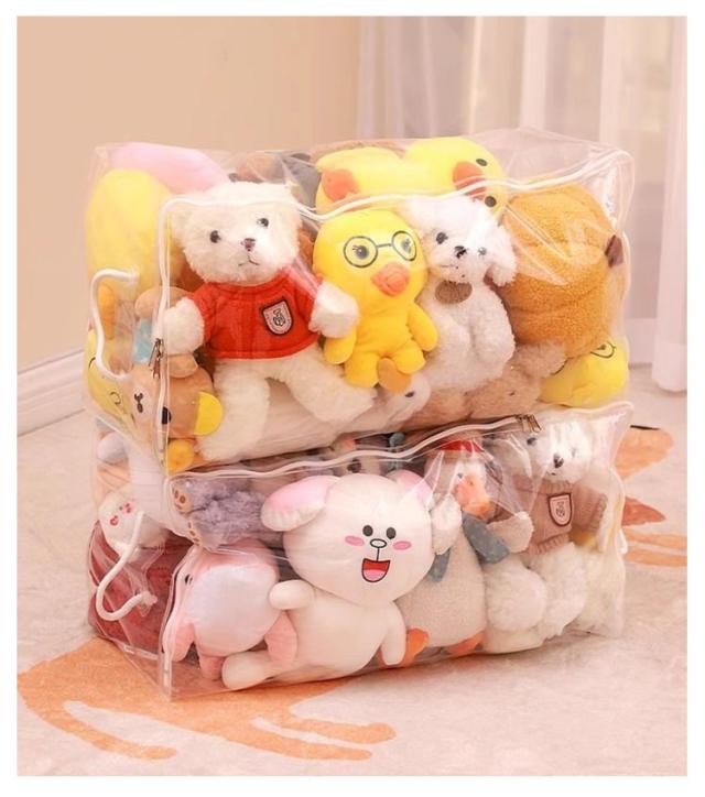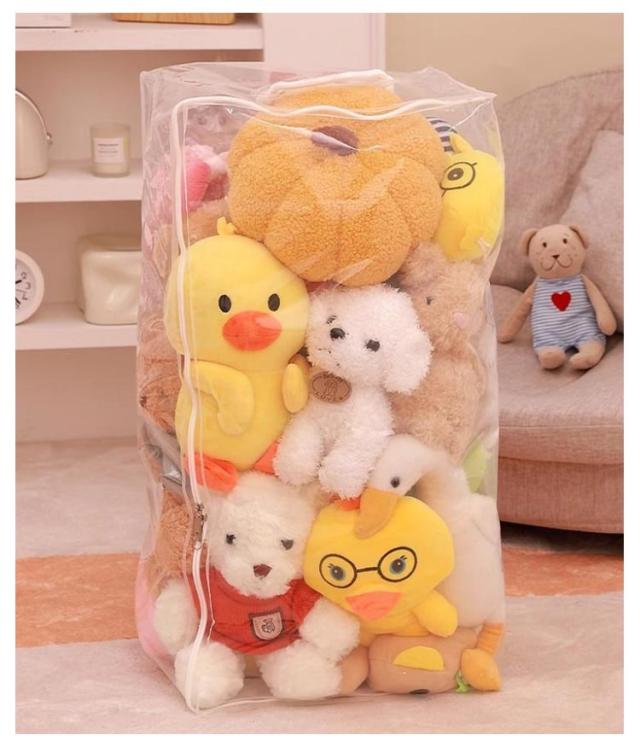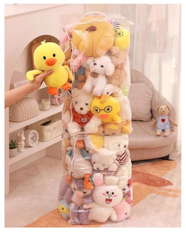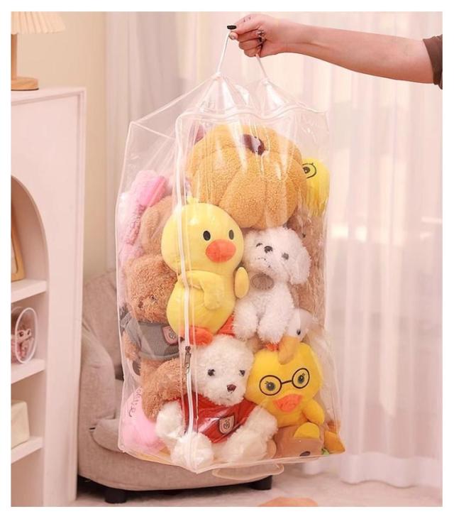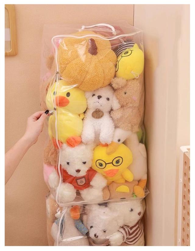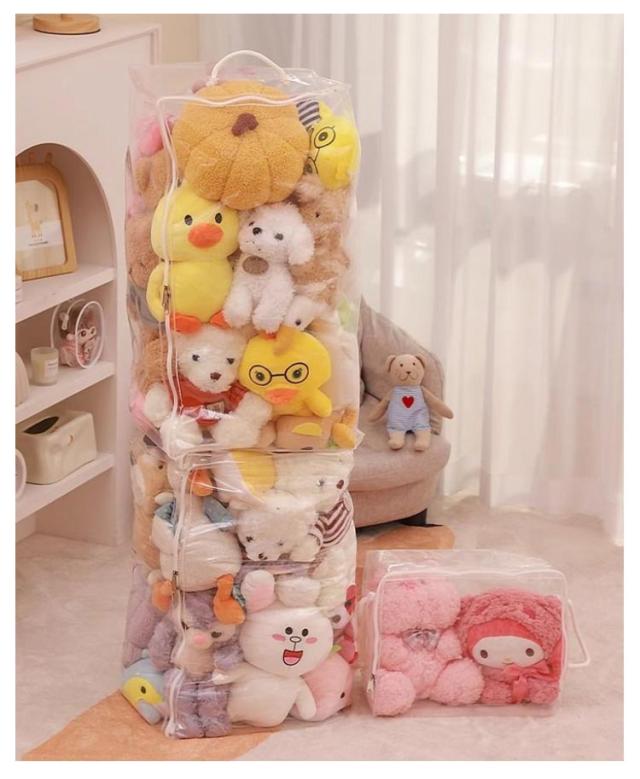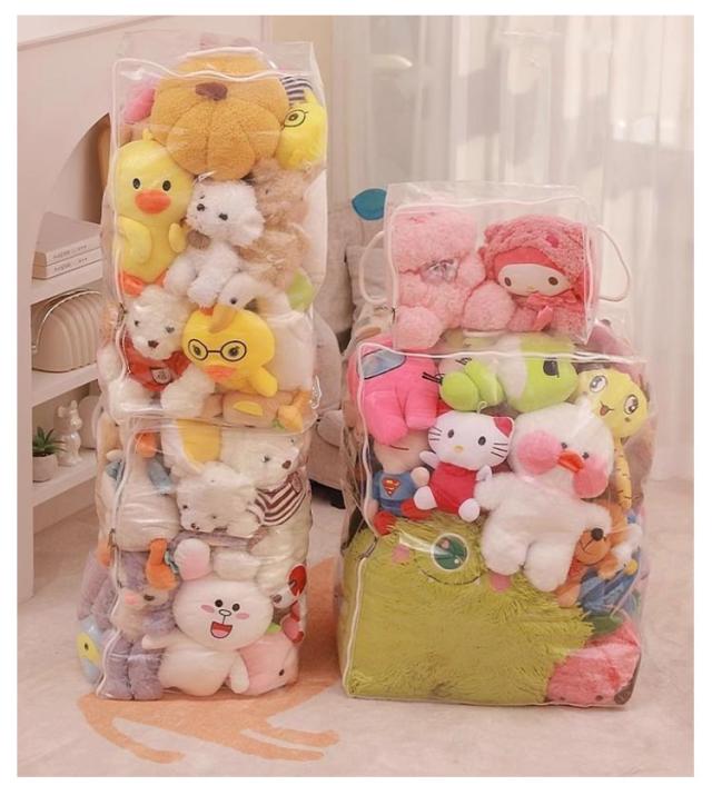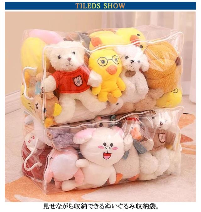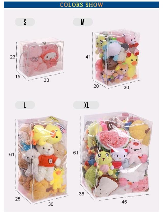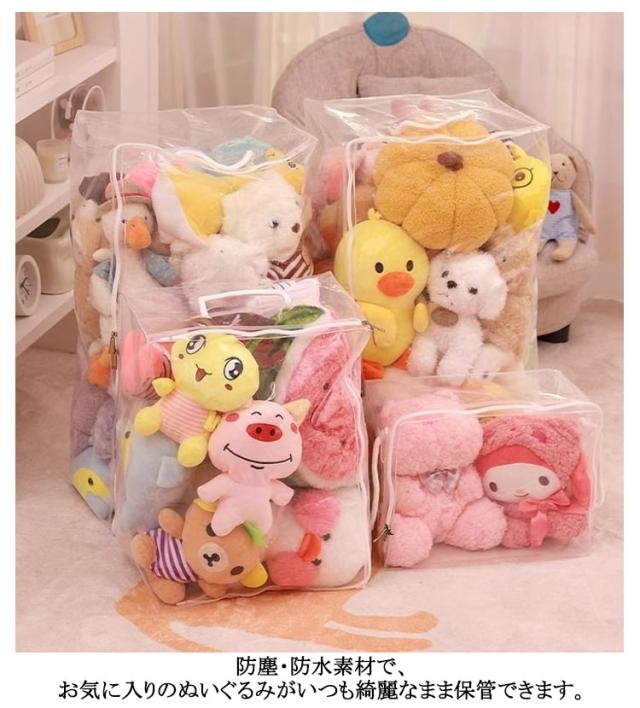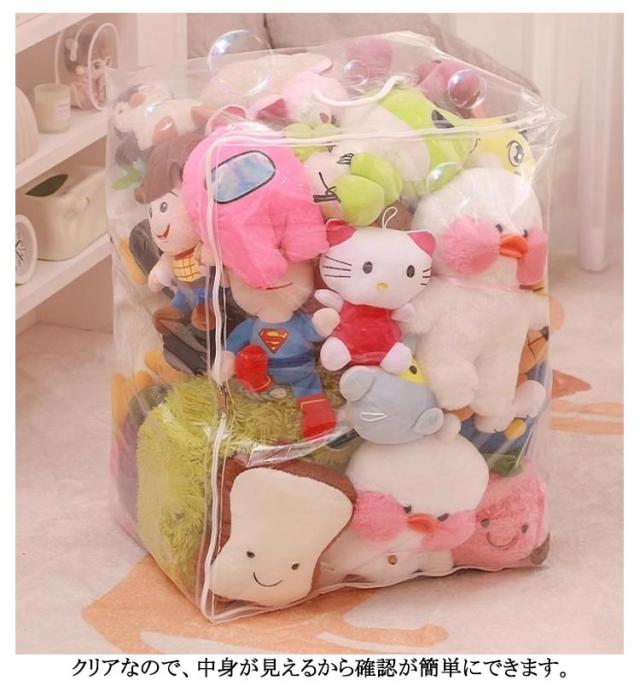 | S M L XL 玩具やぬいぐるみはもちろん、バッグ、ストール、マフラー、衣類、布団など様々な物を収納できる多機能収納ケース 見せながら収納できるぬいぐるみ収納袋。 防塵・防水素材で、お気に入りのぬいぐるみがいつも綺麗なまま保管できます。 クリアなので、中身が見えるから確認が簡単にできます。 | |