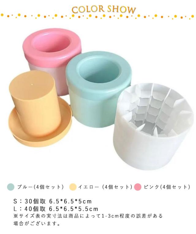 | サイズについての説明 | S:30個取 6.5*6.5*5cm/ L:40個取 6.5*6.5*5.5cm/ ※サイズ表の実寸法は商品によって1-3cm程度の誤差がある場合がございます。 |