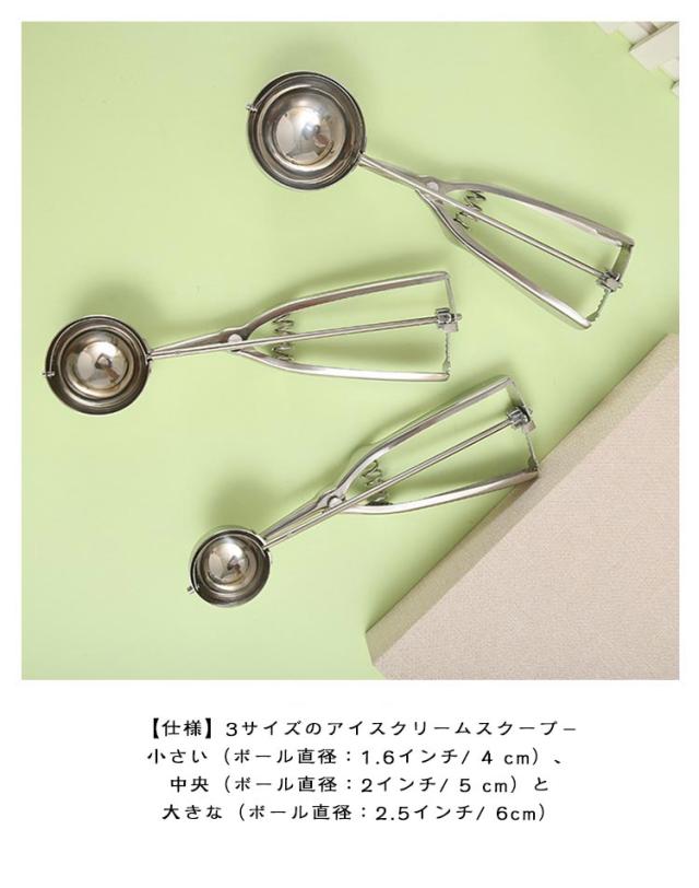| アイスクリームやポテトサラダの盛り付けに 直径40mm+50mm+60mm【3個セット】 【素材】高級ステンレス鋼製、磨き、品質保証、スプリングデザイン、耐久性、厚みのある滑り止めハンドル、手触りの良さ、アイスクリームを楽しむための必需品、果物の掘り出しなどにも使用できます。 【仕様】3サイズのアイスクリームスクープ−小さい(ボール直径:1.6インチ/ 4 cm)、中央(ボール直径:2インチ/ 5 cm)と大きな(ボール直径:2.5インチ/ 6cm) 【用途&使い方】アイスクリームだけでなくポテトサラダや肉団子、ヨーグルト、 味噌や餃子のタネなど様々なものをすくう時に活躍する便利なアイススクープです。 すくった後にハンドルを握ると、金属ワイヤーがアイスと半球の間をツルンっと通り抜け、アイスを落としてくれます。 【広く使われています】アイスクリーム、ポテトサラダ、シャーベット、味噌、つみれ、肉団子、餡子をつつむ時や丸ドーナツなどを定量ですくい取る事ができます。お茶、コーヒー、デザート、スイカに使えて、キッチンやレストランでは欠かせないユーティリティです。 | |