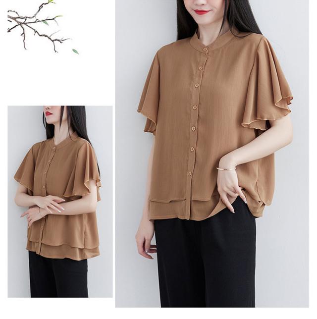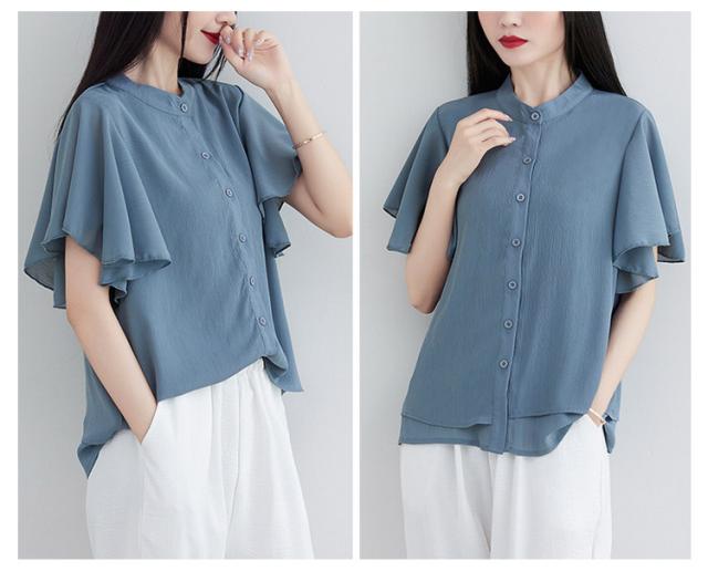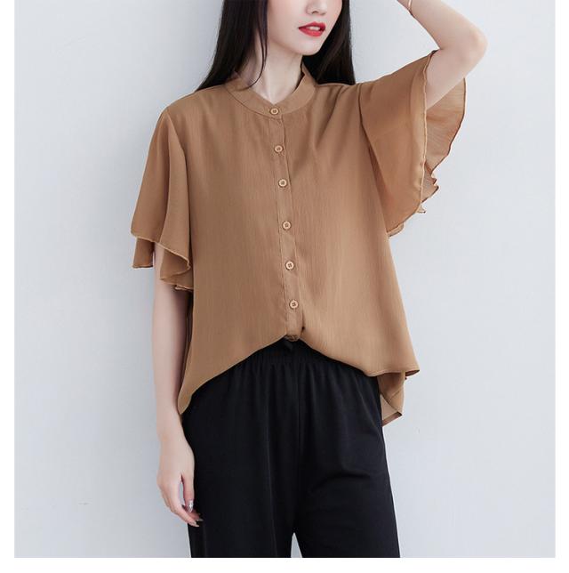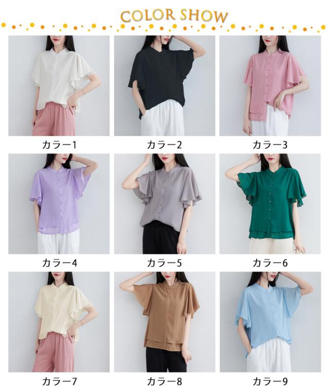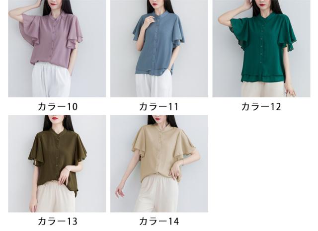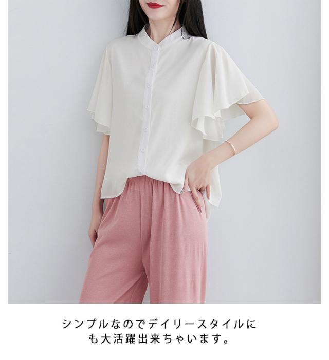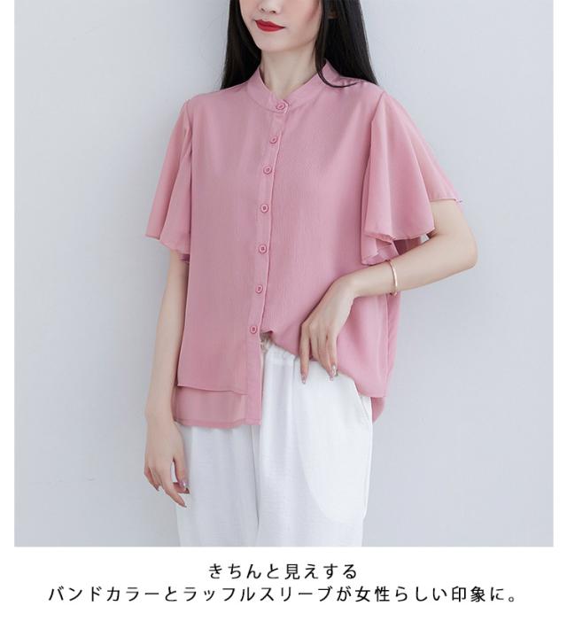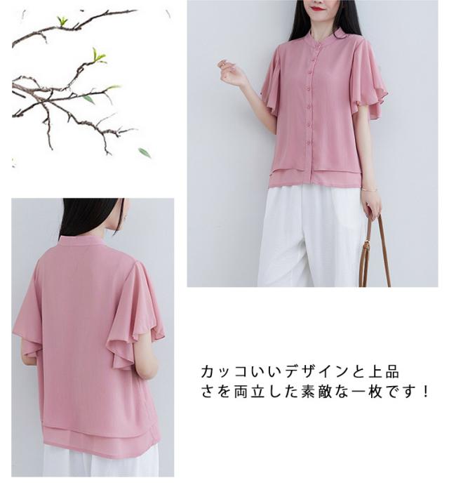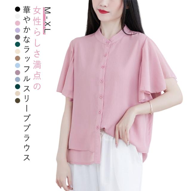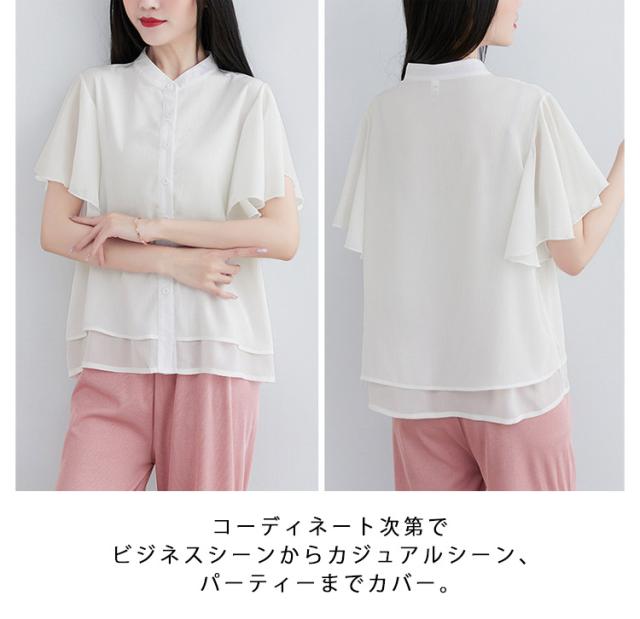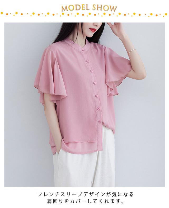 ブラウス 二の腕カバー フレンチスリーブブラウス レディース 体型カバー 夏 半袖 ラッフルスリーブ リラックス フレンチスリーブ Aライン 春 ビッグシャツ シンプル オケージョン フレンチスリーブブラウス 羽織り 大きいサイズ 春
