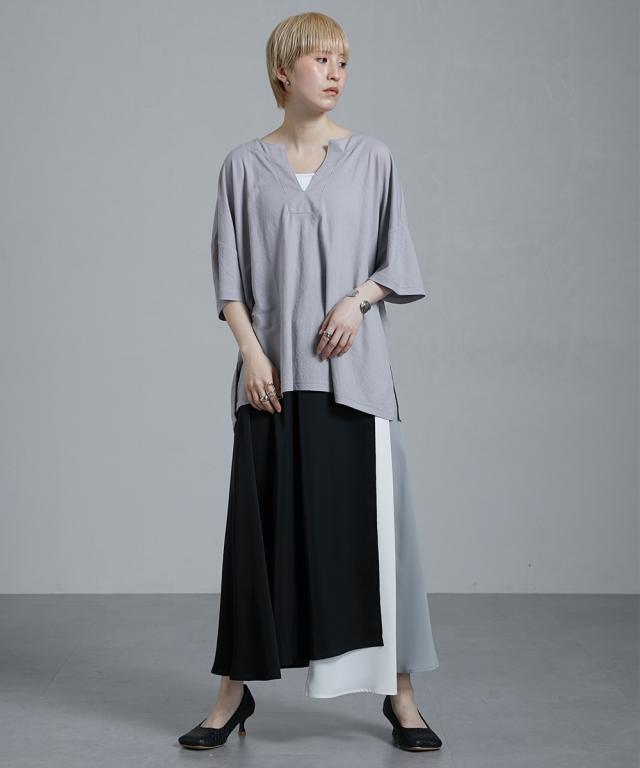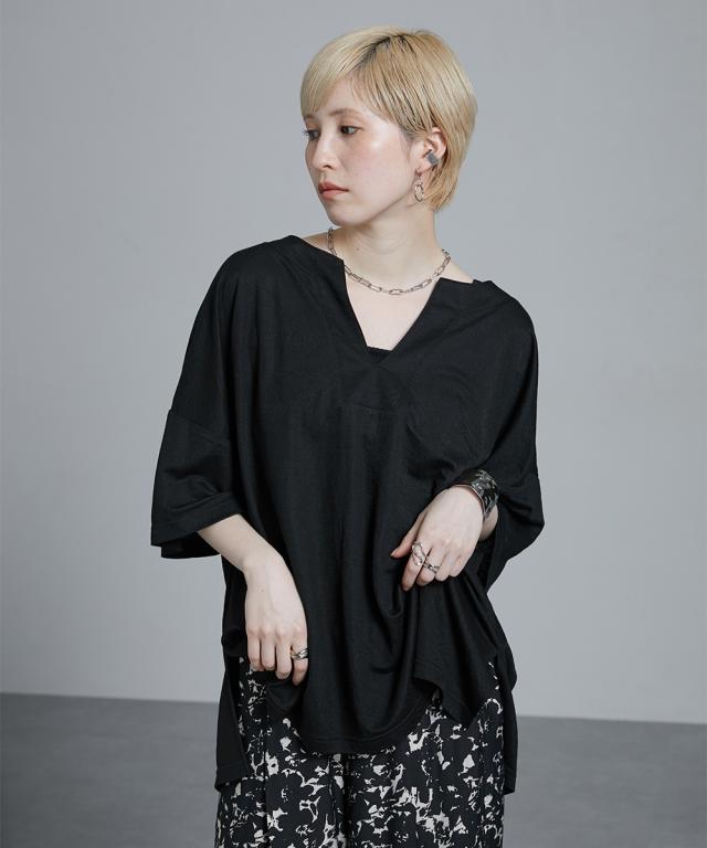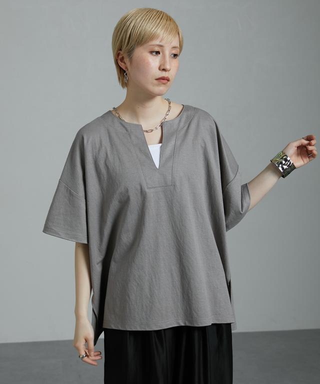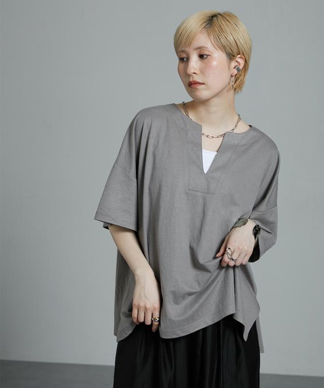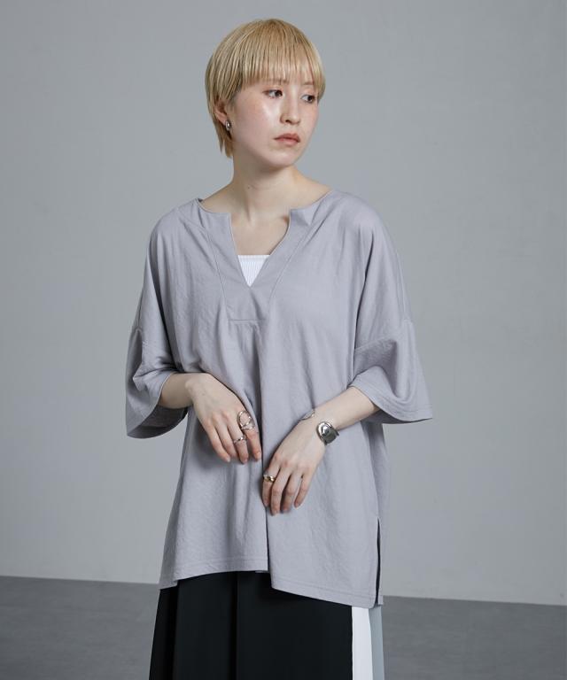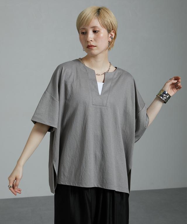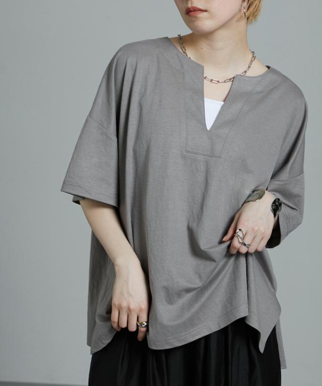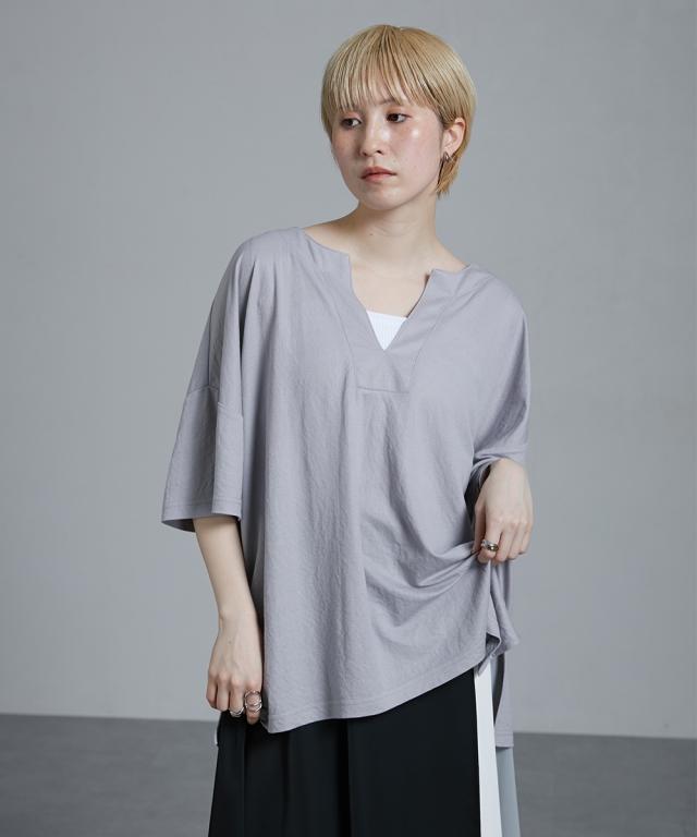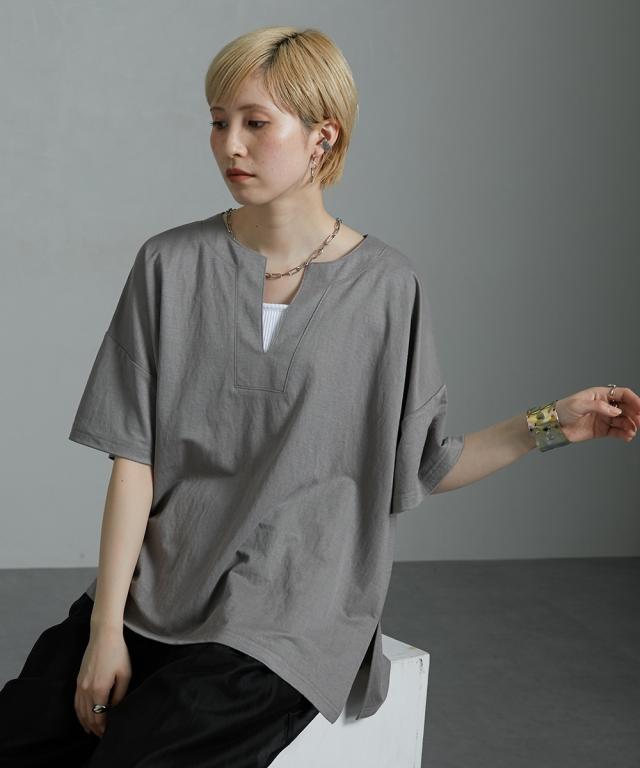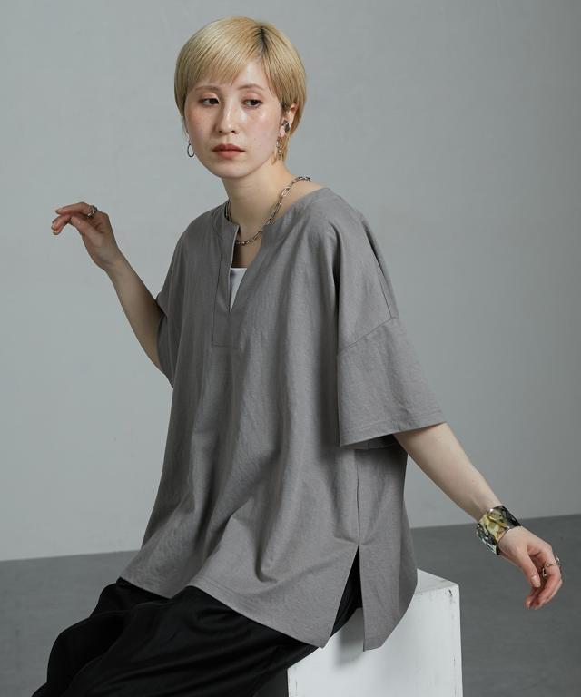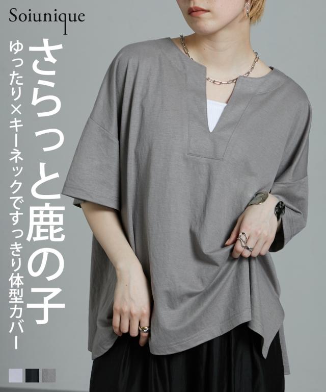 鹿の子素材キーネックデザインゆったりサイズ半袖Tシャツ [Soiunique]
