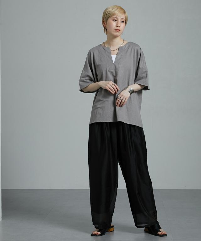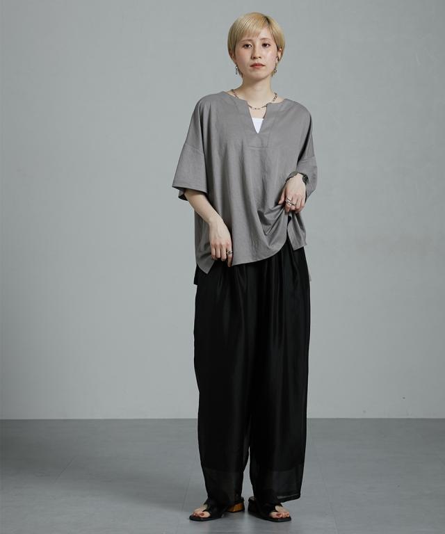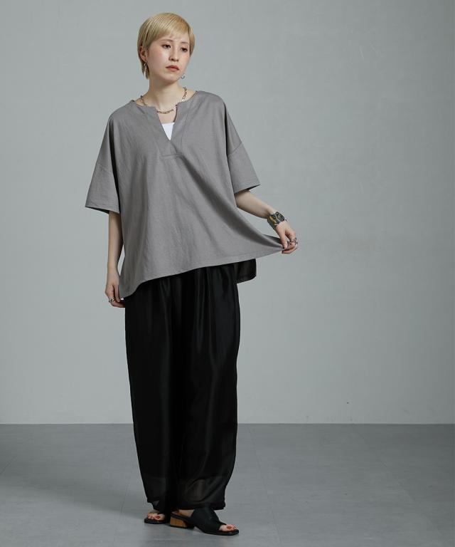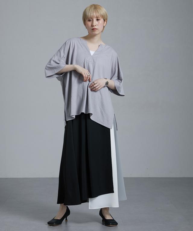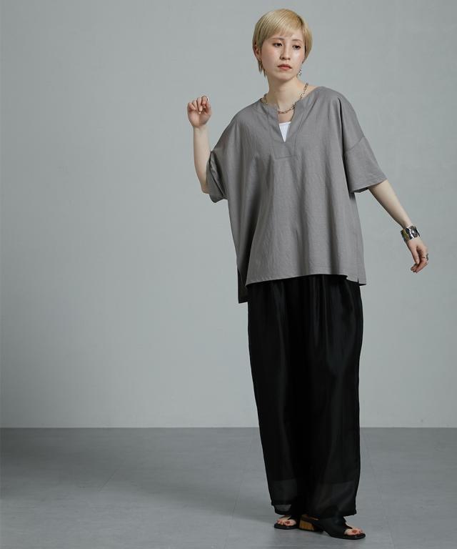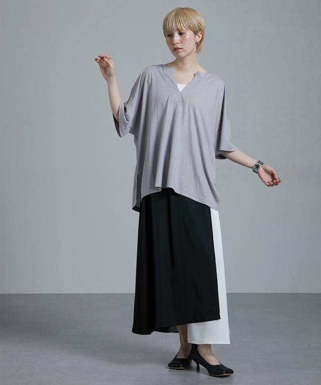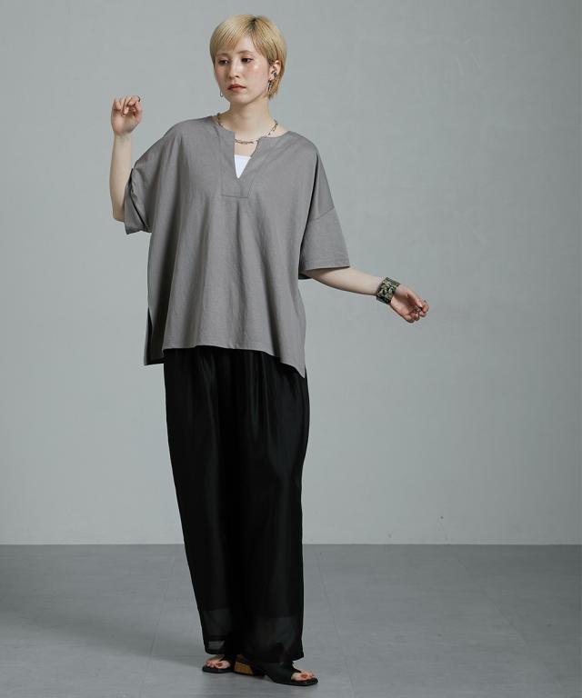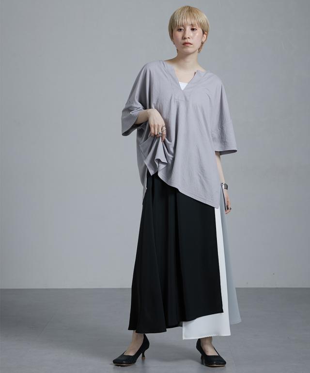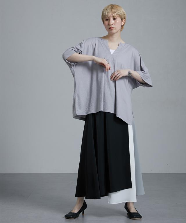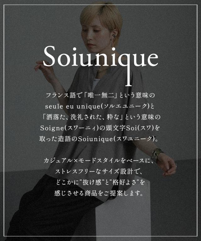■デザイン ・程よい開き具合のスキッパーネックが顔まわりをすっきり見せるトップス ・肩のラインを落としたドロップショルダーと身幅ゆったりのボクシーシルエットでリラックス感たっぷり ・裾はさりげなくラウンドさせ、抜け感のあるシルエットに ・シンプルながらモードに決まるミニマルなデザイン ■素材 ・程よいハリ感と柔らかさを併せ持つ素材 ・さらりとした肌触りでロングシーズン活躍 ■おすすめのスタイリング ・ワイドパンツやスカートと合わせたラフモードな着こなしがおすすめ ・インナーにタンクトップやシアートップスを重ねて奥行きのあるレイヤードスタイルも 【Soiunique/スワユニーク】唯一無二のアナタへ——— カジュアル×モードスタイルをベースに、 ストレスフリーなサイズ設計で どこかに”抜け感”と”格好よさ”を感じさせる商品をご提案。 体型カバーやスタイルアップも叶えつつ、 コンプレックスを個性にして自分のスタイルを貫く唯一無二のアナタへ。
