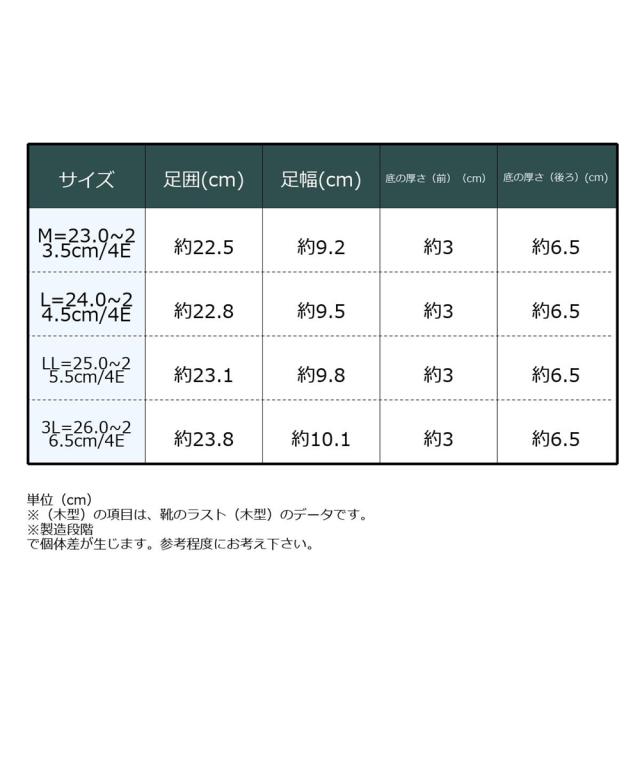材質=合成皮革 底材=合成底 底の厚さ(前)=約3cm 底の厚さ(後ろ)=約6.5cm ワイズ=4E 重量=約350g(Lサイズ片足) ※生産時期や素材などによって多少個体差があります。 原産国:中国製 備考:単位(cm) ※(木型)の項目は、靴のラスト(木型)のデータです。 ※製造段階で個体差が生じます。参考程度にお考え下さい。