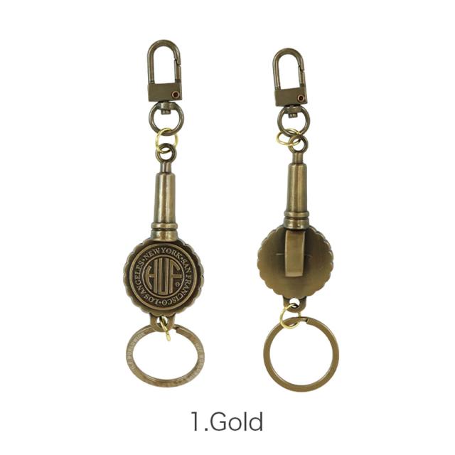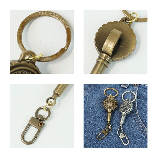 HUF/ハフから、キーチェーンが入荷。ヴィンテージ風のくすんだゴールド/シルバーの合金素材で、エンボス加工のアートワークとレーザー刻印が施された高級感のあるデザイン。