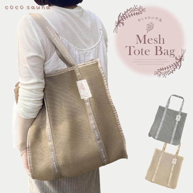 トートバッグ メッシュ サウナ ととのう 銭湯 温泉 お風呂 スパ ジム 岩盤浴 プール アウトドア サ活 ギフト 軽量 サ活 バッグ サウナバッグ メッシュ 通気性 着替え入れ 洗濯 グレー ベージュ レディース coco sauna メッシュトート