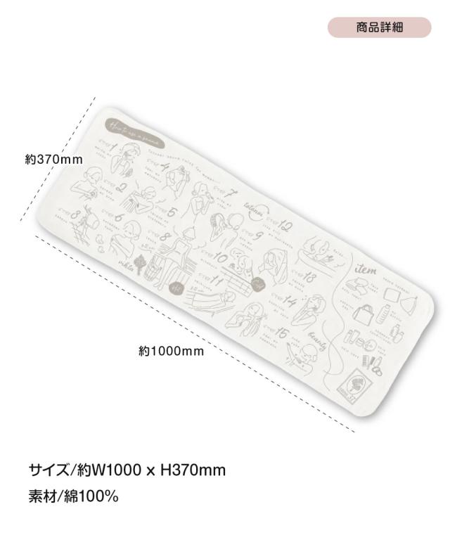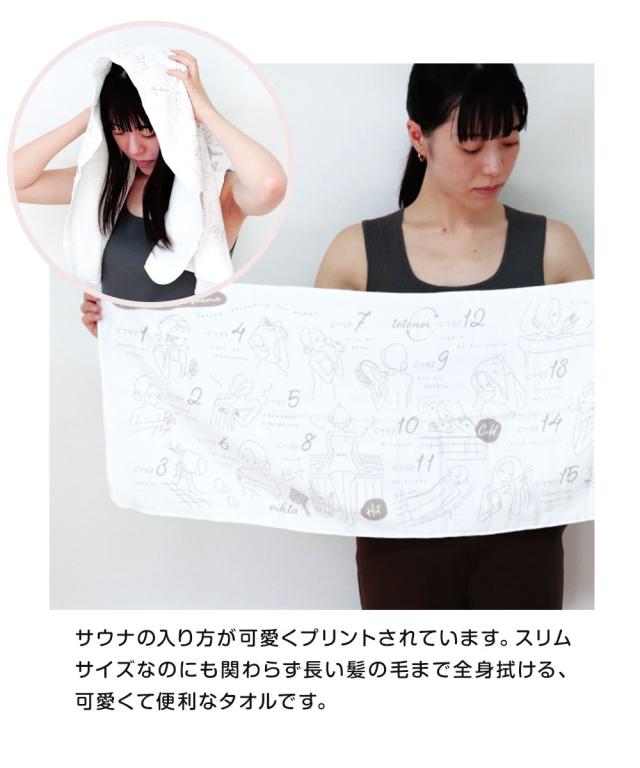 サウナの入り方が可愛くプリントされているバスタオルです。