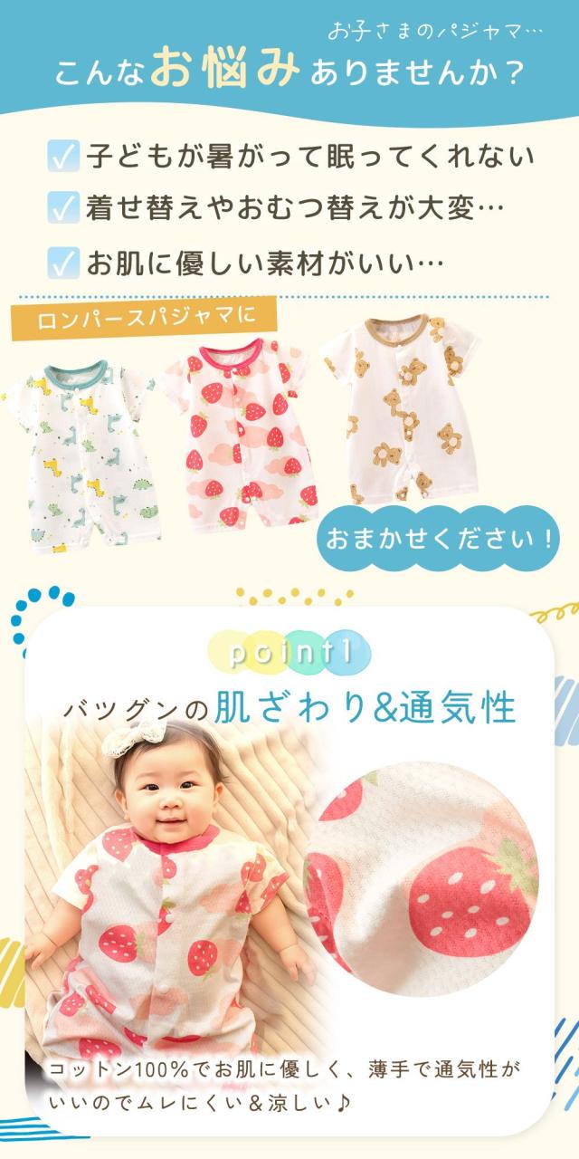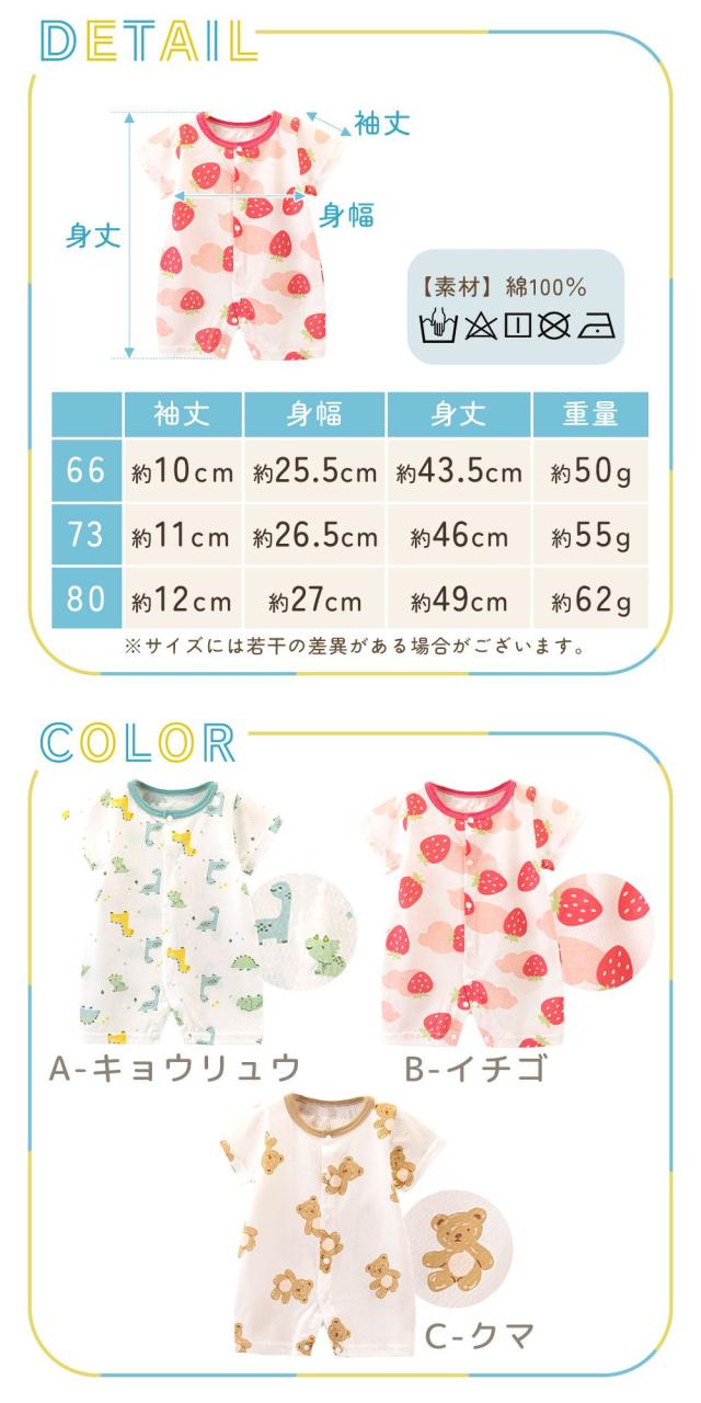 ロンパース/パジャマ/赤ちゃん/ガーゼ/ベビー/新生児服/柄物/半袖/メッシュ/女の子/男の子/子供/こども/子ども/ルームウェア/コットン/綿/寝巻/服/かわいい/おしゃれ/通気性/前開き/ベビー服/スナップボタン/吸水性/カバーオール/夏用/春/綿100%/軽量/生地/薄い/さらさら/夏/春/子供服/洗える/肌着/ガーゼロンパース/ロンパス/恐竜/苺/熊/きょうりゅう/いちご/くま/短肌/部屋着/キョウリュウ/イチゴ/クマ/66/73/80/サイズ