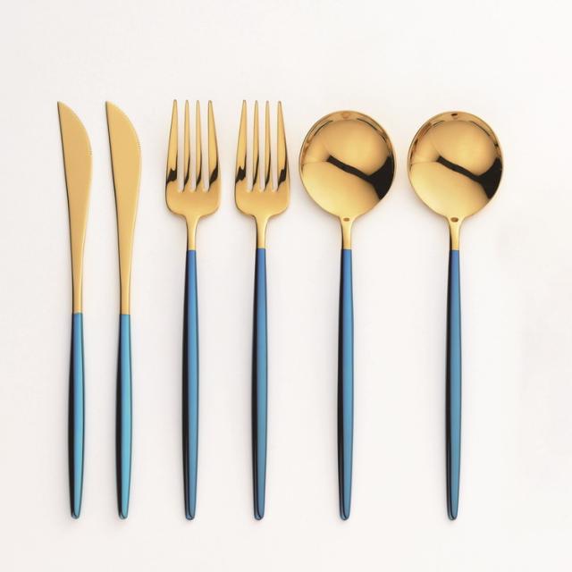 煌びやかな金色の本体と、ブル-の柄が印象的。デザイン性が高くお祝い事にもピッタリ。シンプルな食器と合わせたり、華やかな金縁のプレ-トと合わせるのもピッタリなカトラリー。