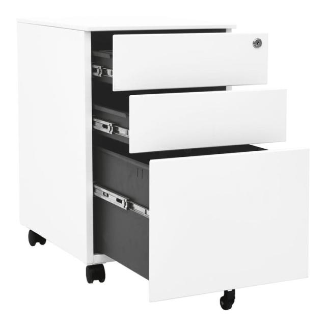 オフィスキャビネットは、一般的なファイリングキャビネットデザインで、ファイル保管に最適です。プレミアムスチール製のオフィスキャビネットです。耐久性があり、お手入れも簡単。組み立ても簡単にできます。鍵付き引き出し3点構成のファイルキャビネットです。ファイルを異なるカテゴリーに整頓し、安全に保管することができます。各引き出しには、取り外し可能な仕切り板がついているため、レターサイズ、リーガルサイズからA4サイズまで、収納する書類のサイズに合わせて自由に調整できます。各引き出しにはボールベアリングによる3段引きスライドレールを備えており、開け閉めもスムーズで、引き出しにかかる負荷が大きくなっても、完全に奥までスライドさせることができます。ファイルキャビネットは机の下に入ります。一般的なキャビネットデザインなので、どんなオフィスにも適しています。