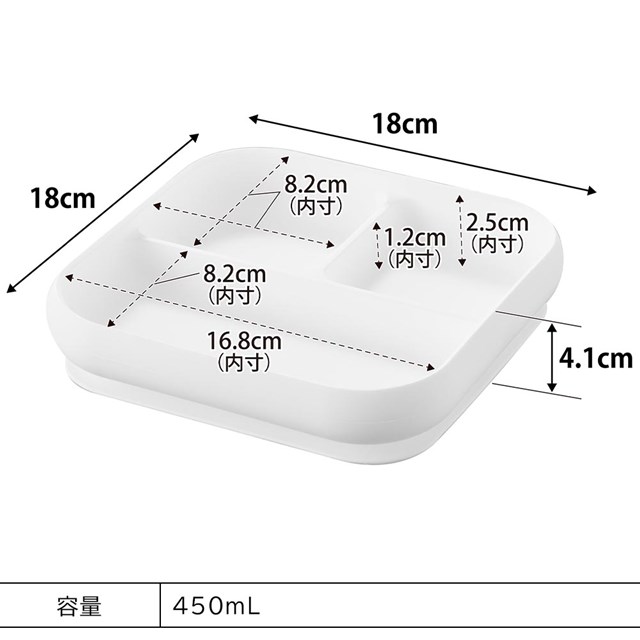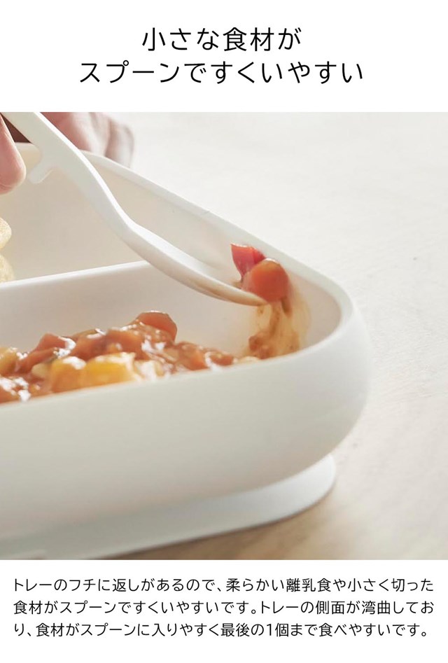吸盤付きで仕切りがあり、トレーのフチに返しがあるのでスプーンですくいやすく、