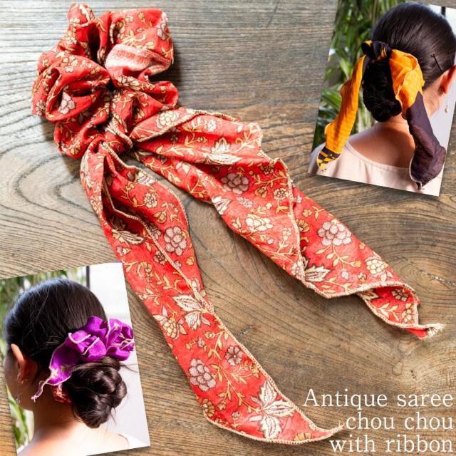 アンティークサリーのリボン付きシュシュ / シュシュ、リボン、 ヘアバンド、髪留め、オールドサリー、ヘアゴム、髪飾り、カラフル、 TIRAKITA(ティラキタ) エスニック衣料 【エスニック・アジアン衣料