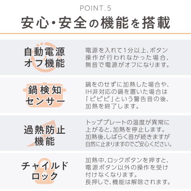 安心の安全機能:自動電源オフ、鍋検知センサー、過熱防止、チャイルドロック付き