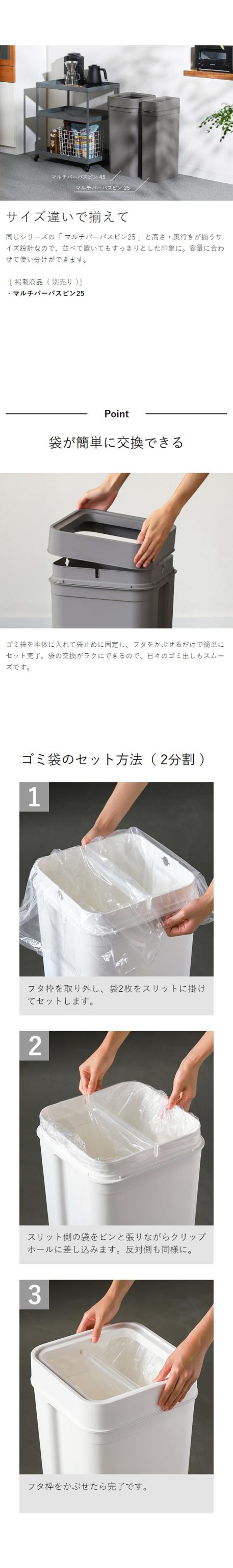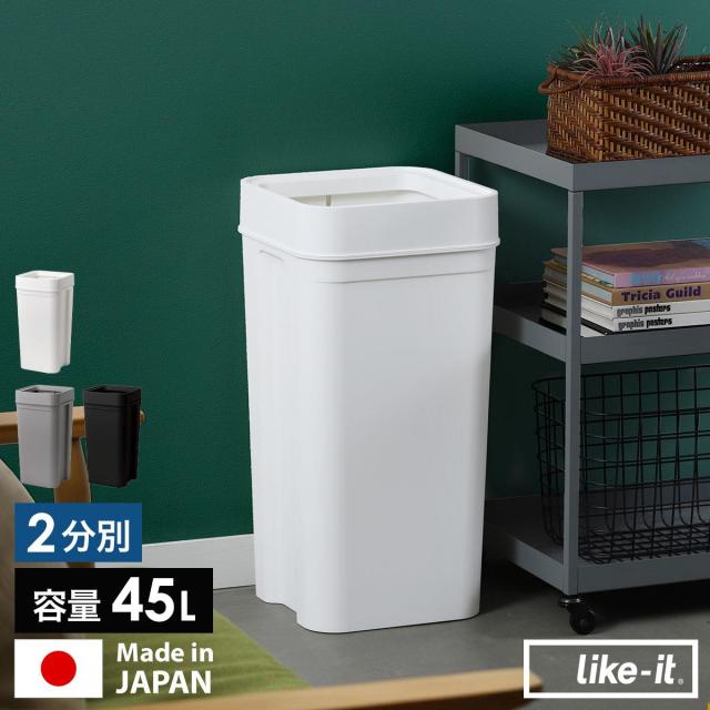 中の仕切りで分別できる 袋が見えないダストボックス 『 like-it( ライクイット )マルチパーパスビン45 』は、中の袋が外にはみ出さないスマートなゴミ箱。フタがない広い開口部でゴミが捨てやすく、インテリアに溶け込むシンプルなデザインが魅力です。袋止めのスリットを使って中を2つに仕切れるから、キッチンやオフィスで省スペースにゴミの分別が可能。サイズ違いの25Lや、シリーズ違いの密閉タイプと高さが揃うので、並べて使えばさらに便利に。使いやすさと美しさを兼ね備えたダストボックスです。