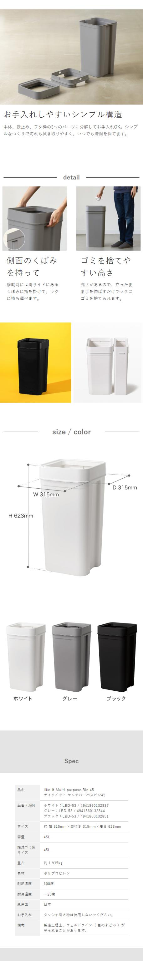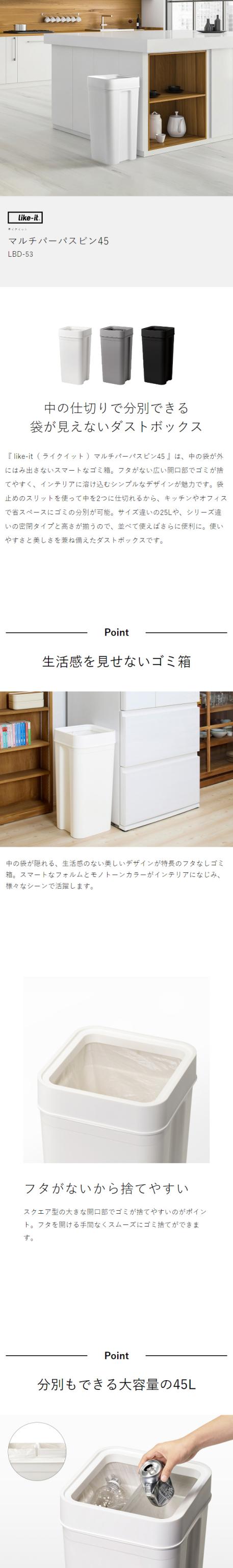 [ Like-it マルチパーパスビン 45 ]ゴミ箱 ごみ箱 ライクイット フタなし 45L 45リットル スリム コンパクト 分別 分別ゴミ ダストボックス キッチン 資源ごみ デスク ダイニング 洗面 オフィス ペットボトル シンプル おしゃれ ホワイト ブラック LBD-53