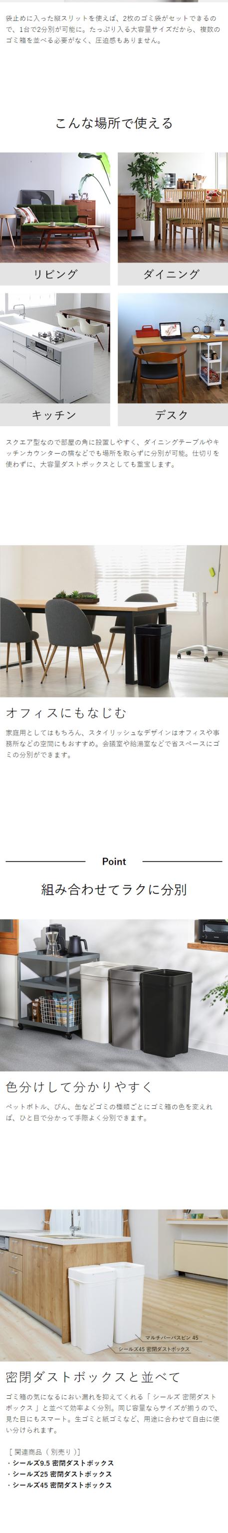 中の袋が外にはみ出さないスマートなゴミ箱。フタがない広い開口部でゴミが捨てやすいシンプルデザイン。中を2つに仕切れるのでキッチンやオフィスで省スペースにゴミの分別ができます。