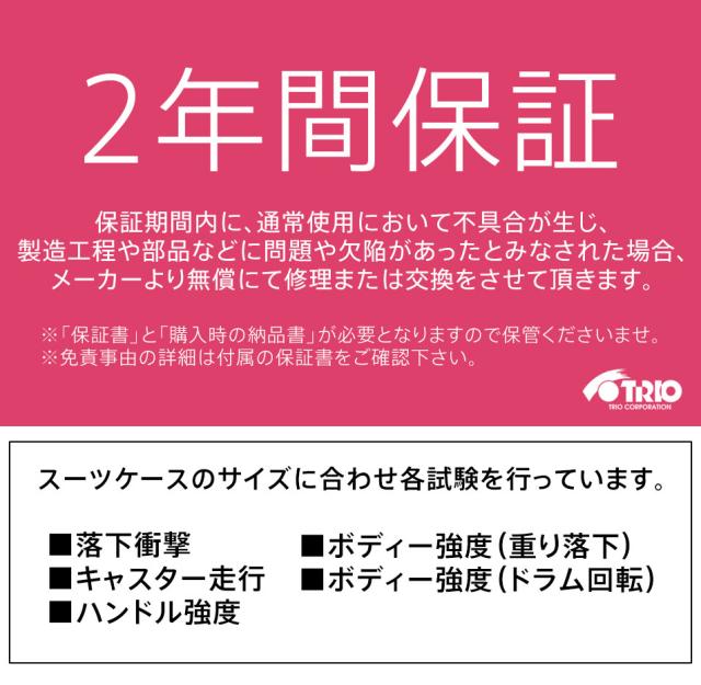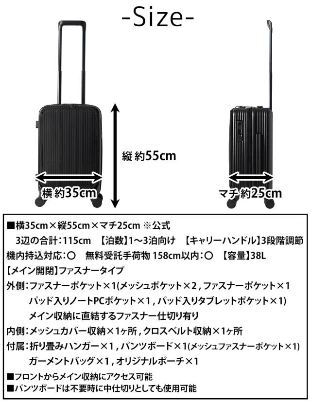 | サイズ(約) ※当店実寸値 | 公式サイズ 全体:横35cm×縦55cm×マチ25cm 3辺の合計(全体):115cm 機内持込対応:〇 無料受託手荷物 158cm以内:〇 【容量】38L 【泊数(目安)】1〜3泊向け 【キャリーハンドル】3段階調節 ※全体サイズはキャスター・ハンドルを含んだサイズです。 | ||