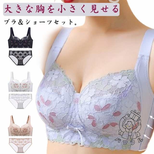 【パワフル】胸を小さく見せるブラ ブラジャー ショーツセット ノンワイヤー レディース シムレスブラ レース 大きいサイズ 薄手 快適 補正下着 胸を小さくみせるブラ 補正ブラ 脇肉