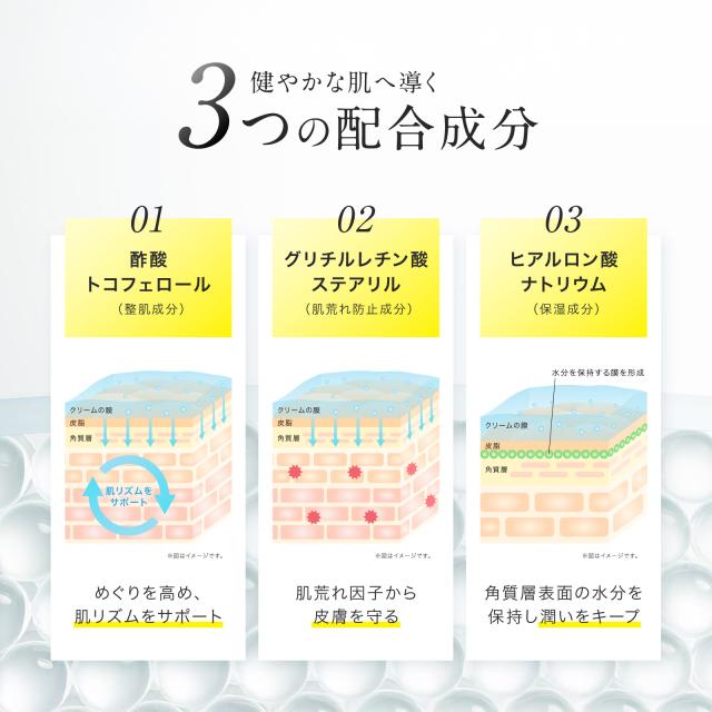 酢酸トコフェロール(整肌成分)、グリチルレチン酸ステアリル(肌荒れ防止成分)配合。