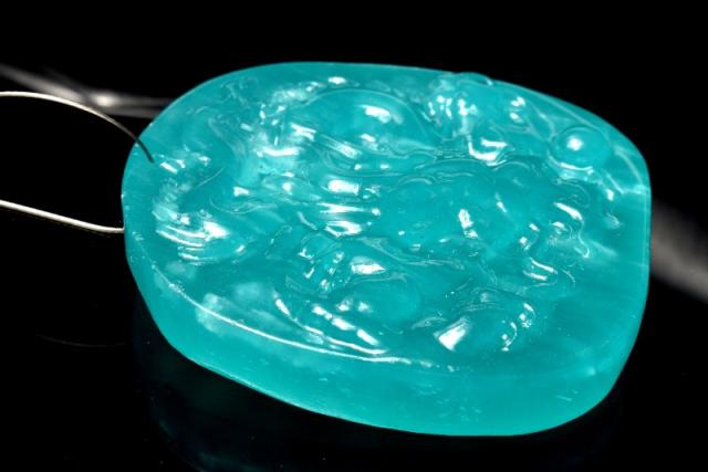 | 特徴・意味 | 縁起物の彫刻が美しい高発色アマゾナイトです。 アマゾナイトはロシア産とペルー産が有名で、ロシア産は緑がかったブルーに白い縞模様が入っており、ペルー産は鮮やかなブルーをしています。 最近流通し始めたウイグル産アマゾナイトは鮮やかなブルーで透明感があります。石の強度を高くするために樹脂を浸透させる「タビライズド加工(含浸処理)」を施しており、この加工によって透明度が増しています。ロシアとペルー産はうまく浸透しないため、ウイグル産だけがこのような質感になるらしいです。 アマゾナイトは英名はブラジルのアマゾン川に由来していますが、その流域では産出せず、アマゾン川流域で採れる色のよく似た石で、アマゾナイトと呼ばれていたものに由来しているようです。和名の天河石は、夜空のあまのがわに由来しています。 心を和ませてくれるような美しくやわらかな青緑色は、形成成分に含まれる鉛イオンによるものです。表面はガラス光沢か真珠光沢を放っており、四角柱状で産出することが一般的です。 |