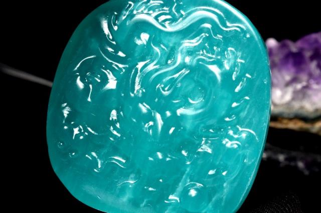 【1点物】高発色 アイスアマゾナイト 43x41mm 青龍彫刻(トップ穴) ルース 【ネコポス送料無料】_PC4290