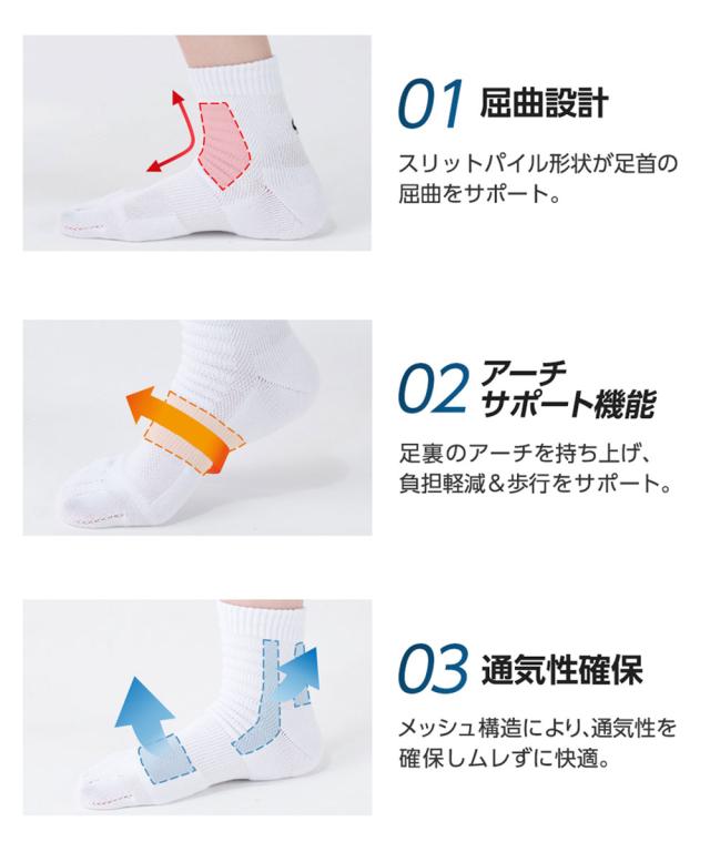 足裏アーチサポート機能&パイル編みによる衝撃吸収設計で運動時の負担を軽減。