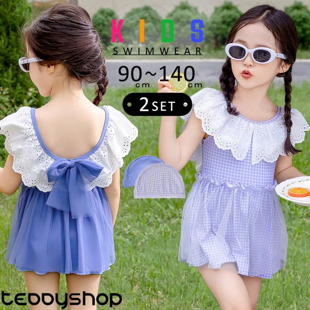 夏新作 キッズ ワンピース 水着 女の子 オールインワン リボン ビッグカラー ギンガムチェック リブ レース カラフル フリル チュール キャップ付き 2点セット 90 100 110 120 130 140 露出控えめ 幼稚園 保育園 小学生 低学年 高学年 プール 海