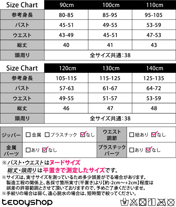 ※バスト・ウエストはヌードサイズ、総丈・頭周りは平置きで測定したサイズです。