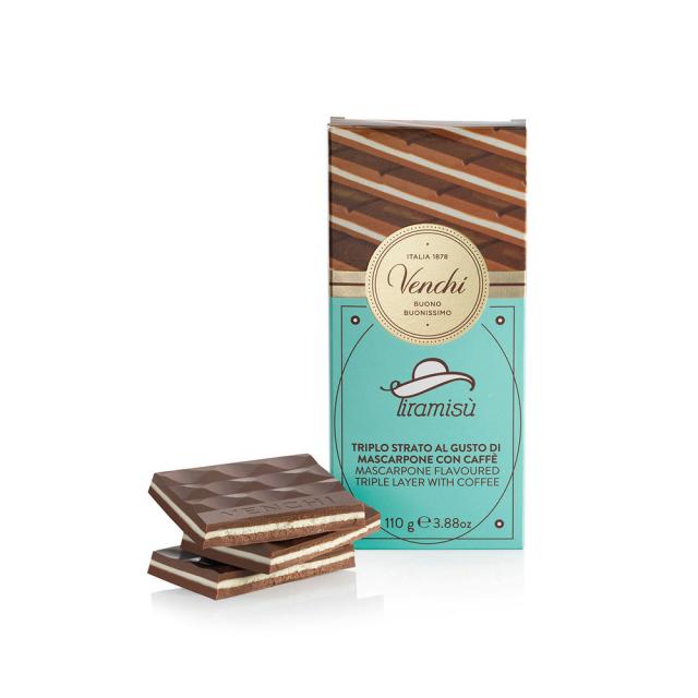 コーヒーペースト、マスカルポーネ風味クリーム、ダークチョコレートの 3 層でティラミスを表現したバー。