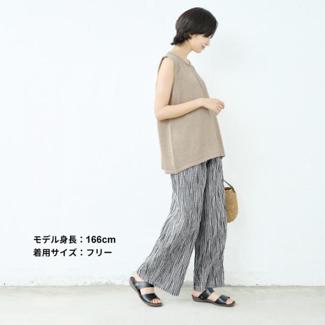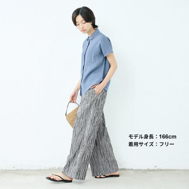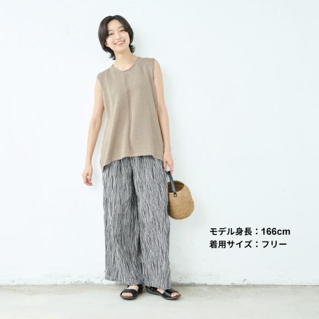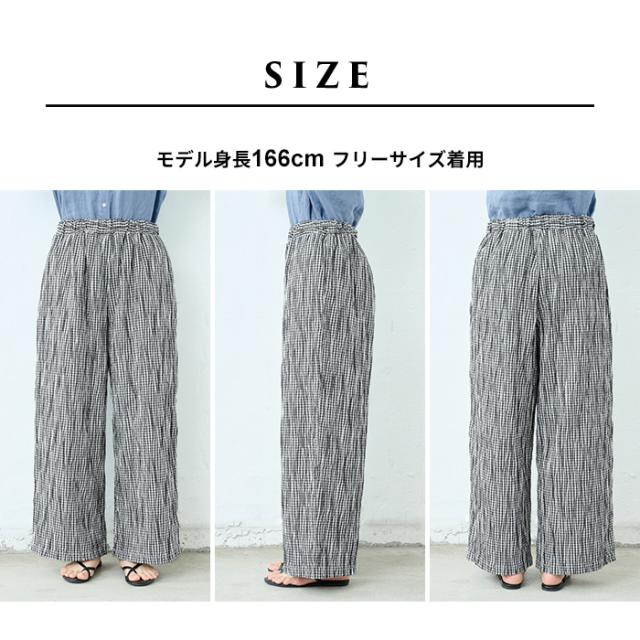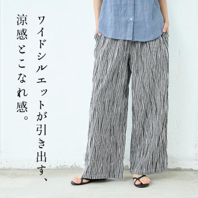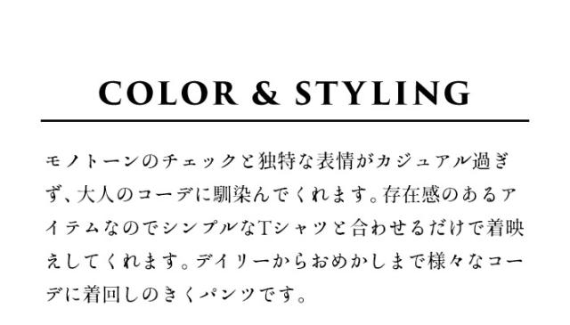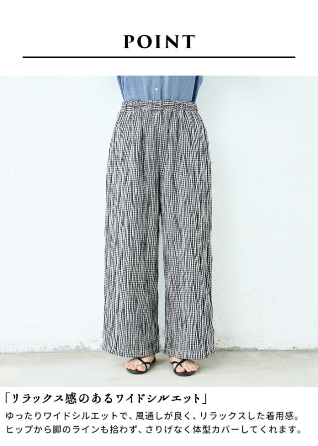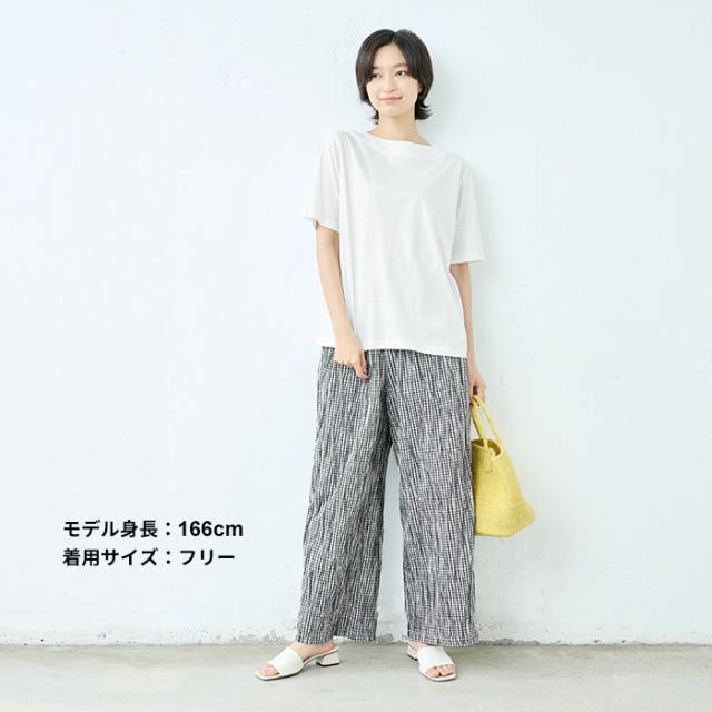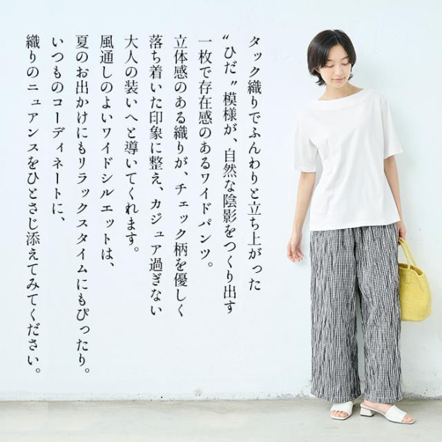 特徴 タック織りでふんわりと立ち上がった“ひだ”模様が、自然な陰影をつくり出す一枚で存在感のあるワイドパンツ。立体感のある織りが、チェック柄を優しく落ち着いた印象に整え、カジュア過ぎない大人の装いへと導いてくれます。風通しのよいワイドシルエットは、夏のお出かけにもリラックスタイムにもぴったり。いつものコーディネートに、織りのニュアンスをひとさじ添えてみてください。