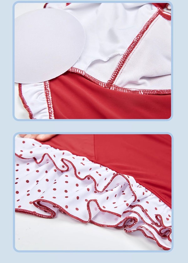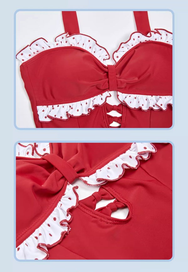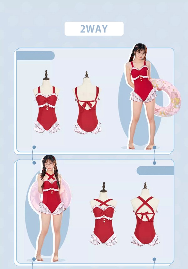ワンピース水着 レディース 水玉柄 2WAY リボン かわいい フリル 水着 肩出し 着痩せ 水着 ノースリーブ 学生 小柄 コスプレ 衣装 撮影 写真用 映える 温泉 プール ビーチ レッド M L XL