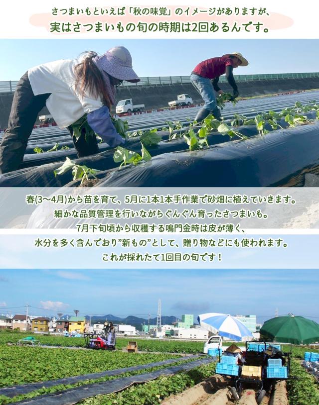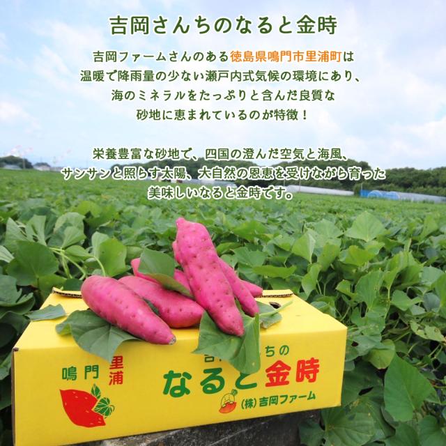 吉岡ファームさんの砂畑は、温暖で降雨量の少ない瀬戸内式気候の徳島県鳴門市里浦町にあります。海沿いに位置する里浦は、海のミネラルをたくさん含んだ良質な砂地に恵まれています。四国の澄んだ空気と海風、サンサンと照らす太陽と、自然の恩恵をたっぷりと受けて育ったなると金時です。