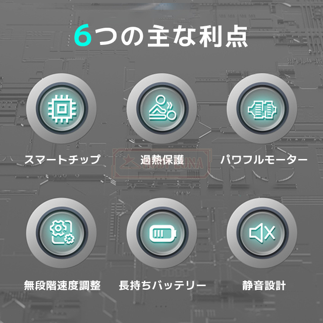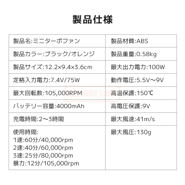 | 使用時間 | ◆1速:60分/40,000rpm ◆2速:40分/60,000rpm ◆3速:25分/80,000rpm ◆暴力:12分/105,000rpm |