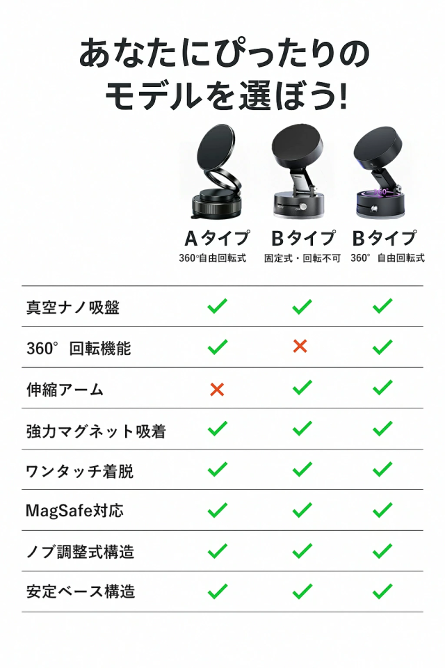 Q1:どのスマートフォンに対応していますか? A1:MagSafe対応のiPhone(iPhone 12以降)はケース越しでもそのまま使えます。AndroidやMagSafe非対応機種も、付属のメタルリングを貼れば使用可能です。 Q2:スマホを縦・横どちらでも固定できますか? A2:はい、マグネット式なので縦置き・横置きどちらにも自由に調整できます。ナビ利用や動画視聴にも最適です。 Q3:本体の取り付けは難しいですか?工具は必要ですか? A3:いいえ、工具不要です。吸盤底部のレバーを回すだけで簡単に取り付け・取り外しができます。設置はわずか3秒で完了します。 Q4:吸盤は外れやすくないですか? A4:いいえ、真空ナノゲル吸盤を採用しており、ダッシュボードの凹凸にも強力に密着します。洗って繰り返し使えるのも特徴です。 Q5:運転中の振動やカーブでもスマホは落ちませんか? A5:N52ネオジム磁石を20個内蔵しており、急ブレーキや悪路でもしっかり吸着を維持します。スマホがズレたり落ちる心配はありません。 |