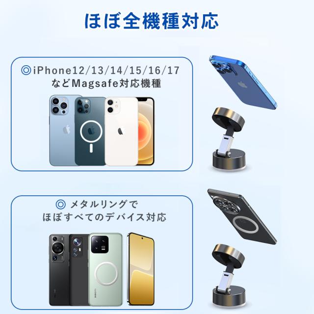 | 対応機種 | MagSafe対応iPhone(12シリーズ以降)および、付属メタルリング装着の各種スマートフォン |