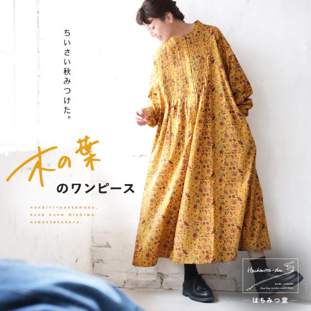 【ついに再入荷!】はちみつ堂 木の葉のワンピース レディース ロング Aライン フレア 長袖 ノーカラー バンドカラー