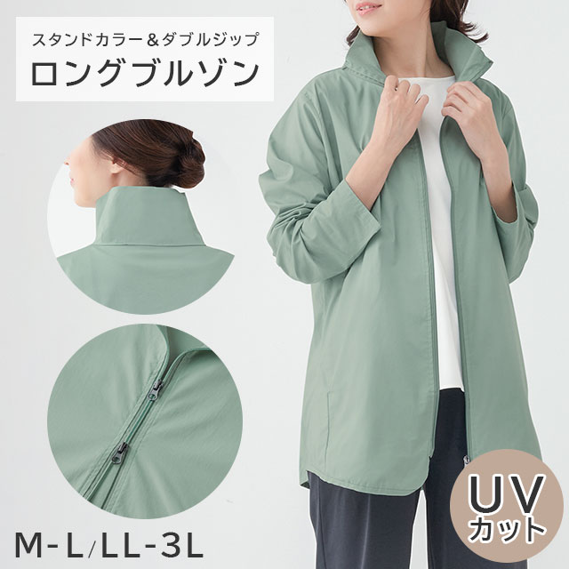 首をしっかりカバーするUVカットロングブルゾン ペールグリーン/ネイビー/モカ/ギンガムブラック M-L/LL-3L セルヴァン
