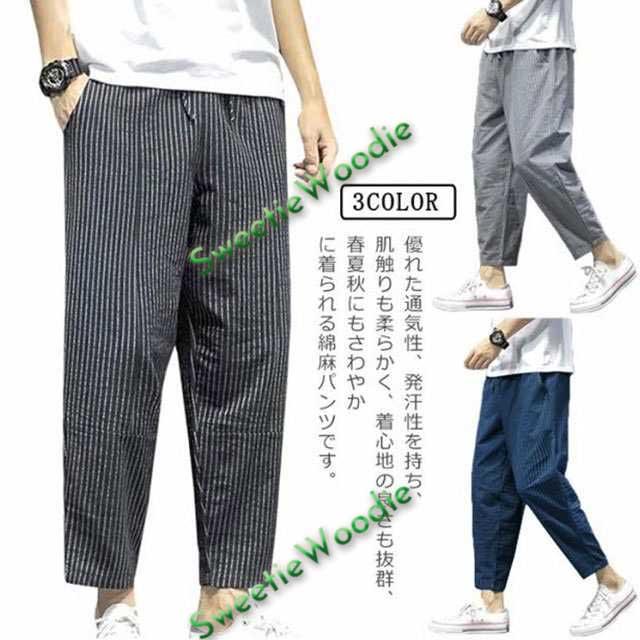 サルエルパンツ メンズ 九分丈 リネン 綿100% スリム ストライプ柄 春夏 綿麻パンツ リネン パンツ ゆったり イージーパンツ ルームパンツ 通勤 通学 M-5XL