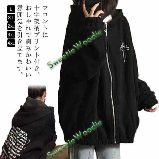 地雷系 パーカー レディース クロス 十字架 病みかわいい サブカル系 フード付き 長袖 ジップアップ トップス アウター オーバーサイズ ビックシルエット メンズ 男女兼用 原宿系 ストリート系 カジュアル トップス ギャル 服 おしゃれ ビッグパーカー
