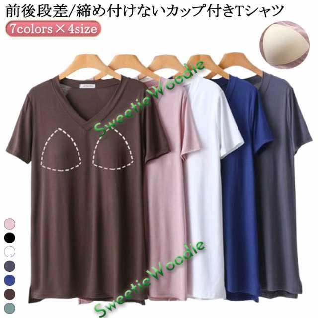ロング丈 Tシャツ レディース 半袖 tシャツ レディース 半袖 ロング丈 柔らかい インナー カップ付きTシャツ vネック ロング丈 パット付半袖Tシャツ 半袖 五分袖 ルームウェア カップ付き 大きいサイズ ブラトップ ゴムなし ラウンドネック 吸湿 速乾 無地