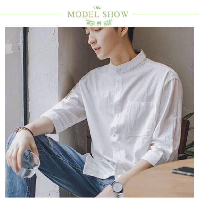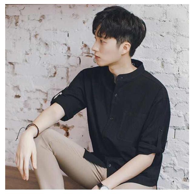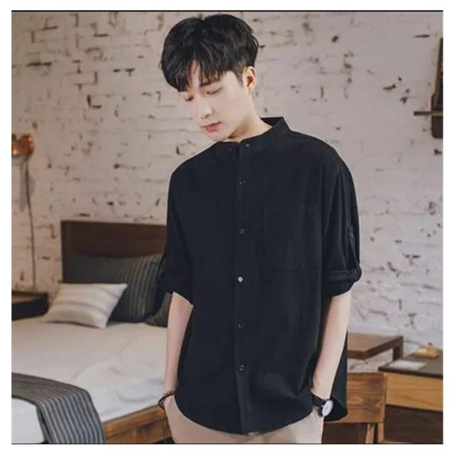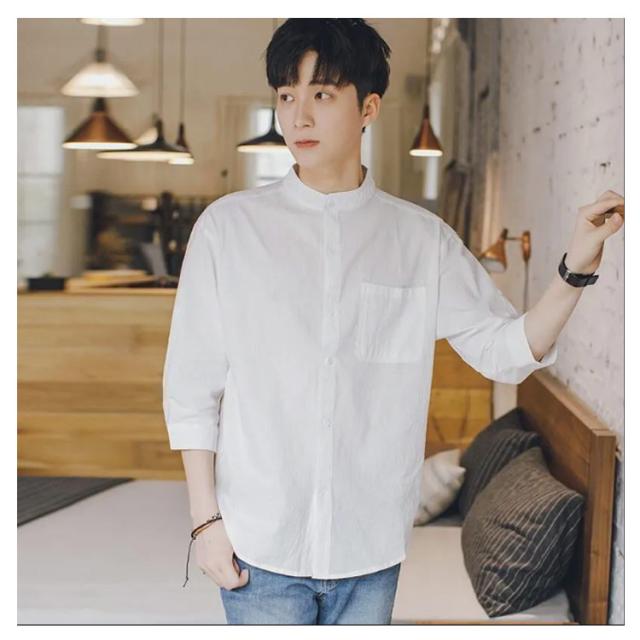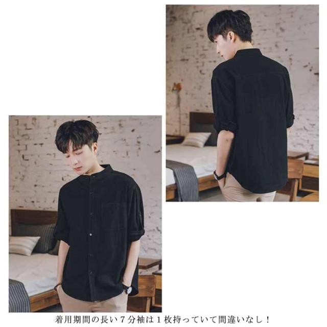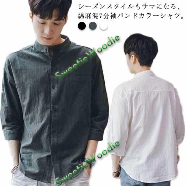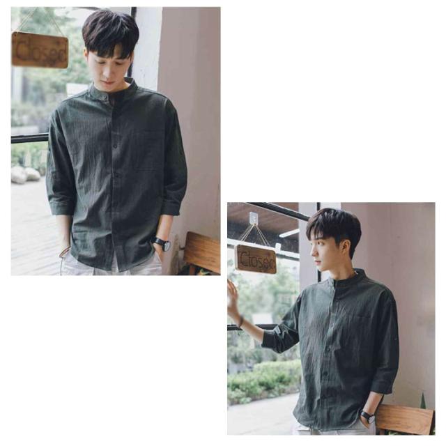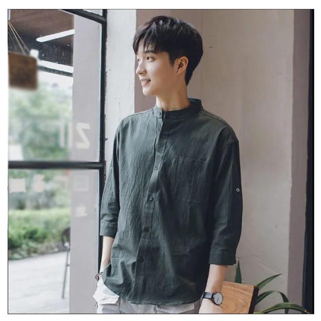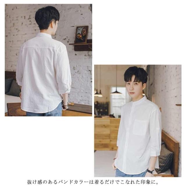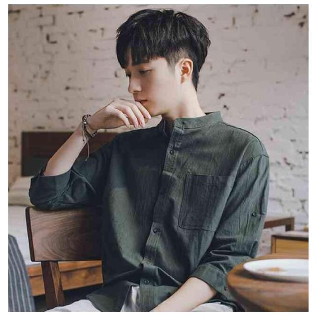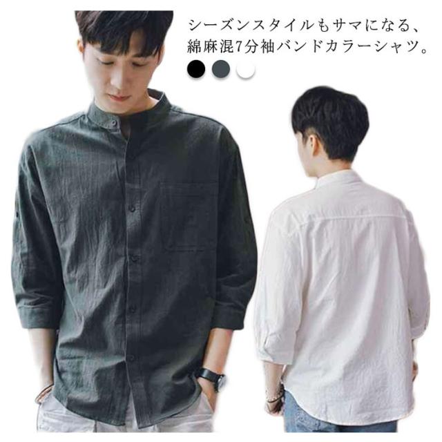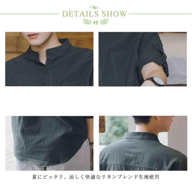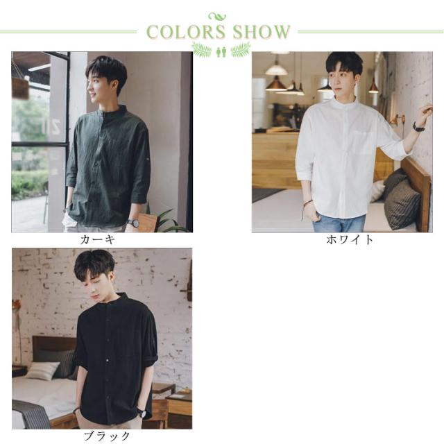 【送料無料】リネンシャツ 七分袖 バンドカラー 夏 メンズ ゆったり 綿麻混 ポケット付き 無地 羽織り 通勤 カジュアル フォーマル シャツ シンプル おしゃれ 大きいサイズ 涼しい 部屋着 カーキ L 2L 3L 4L