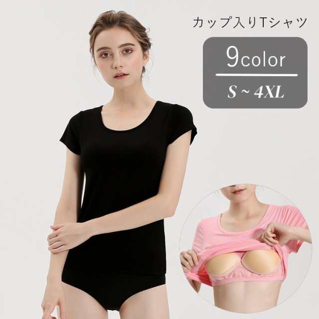 【ポイント5倍!】カップ付きTシャツ カップ付きカットソー ブラトップ レディース 女性 半袖 丸首 ラウンドネック クルーネック 大きいサイズ