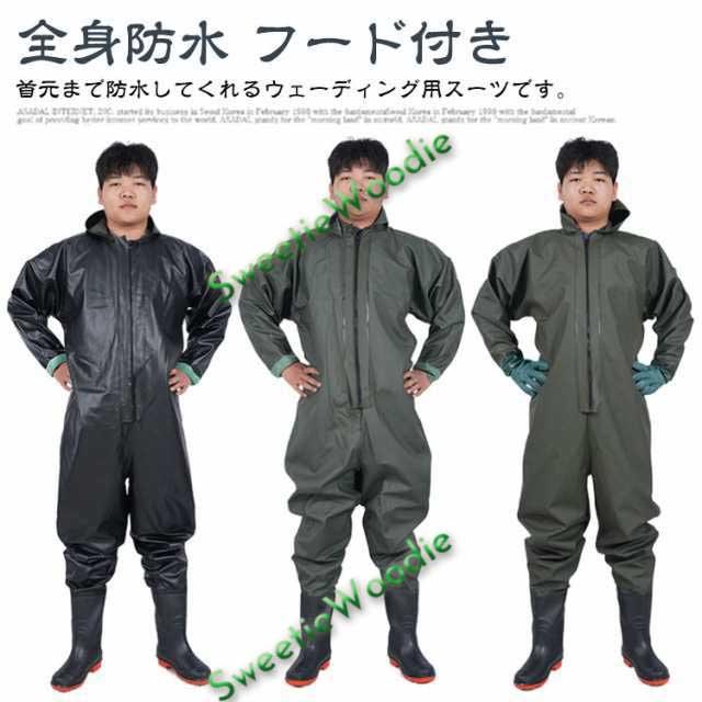 | 【全身防水】【フード付き】 ・首元まで防水してくれるウェーディング用スーツです。 ・ほぼ全身を水の浸入から守ってくれますよ。 ・このウェーダーはつなぎのように全身を覆うので動きやすく、上半身が水はねで濡れることもありません。 ・フード付きで全身をすっぽり覆ってくれる防水着なので、雨天の作業でも雨風からあなたの体をしっかりガード。 ・レインコートのように豪雨ではだけることもないので、台風などの緊急時の救護作業でも威力を発揮します。 ・素材は厚手のPVCで傷つきにくく、水の侵入はもちろん外気からも肌をしっかり守ります。 ・胸ファスナーも水の侵入を防ぐ仕様で、さらにその下にも防水布を装備。 ・靴底も滑り止めの着いた弾力素材なので履き心地もGood。 ・全体を立体成型しているので動きやすさもバッチリです。 ・漁業や農業、工事現場など様々なシーンで活躍してくれる防水着です。 | |