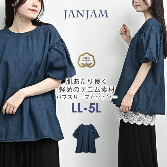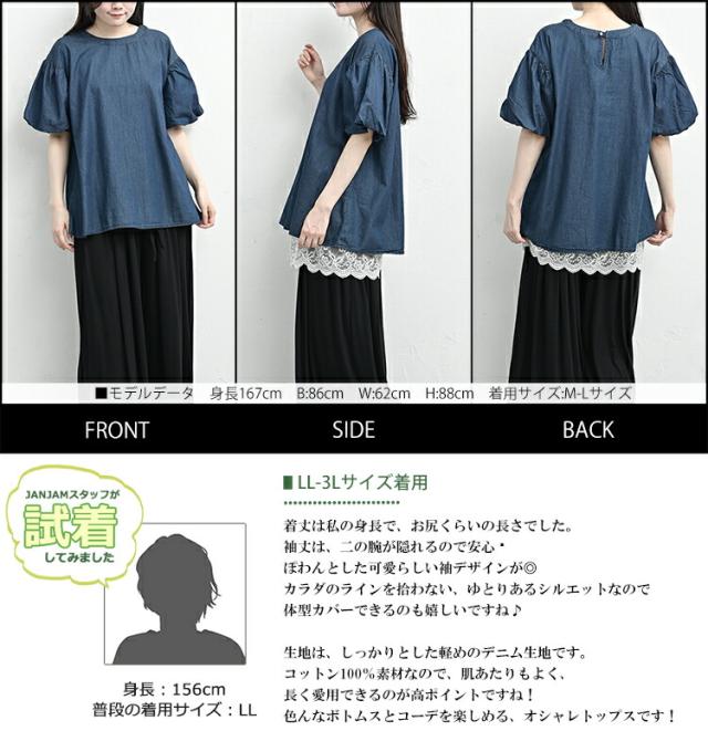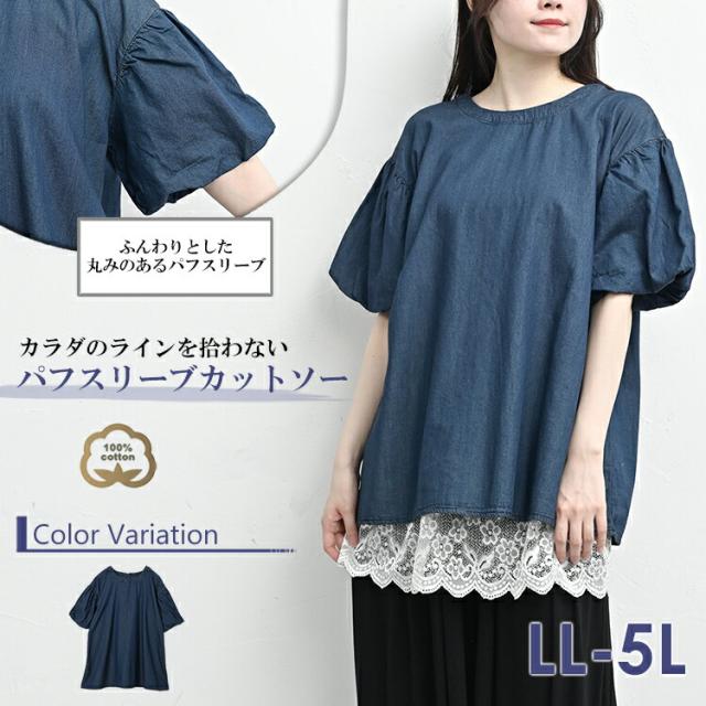 大きいサイズ レディース パフスリーブシャツ メール便対応 半袖 デニム生地 エアリー カットソー トップス cotton100 LL-3L/4L-5L ゆったりサイズ ぽっちゃり女子 プラスサイズ