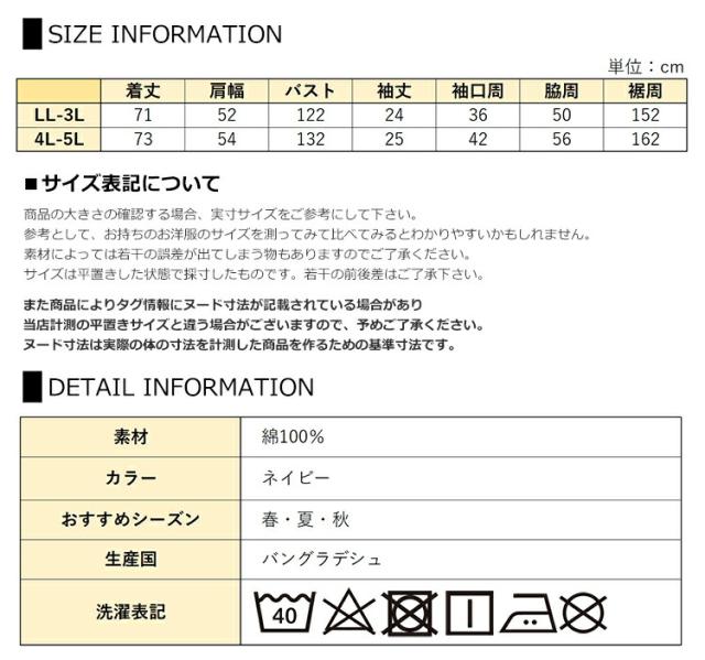 LL-3L:着丈71 肩幅52 バスト122 袖丈24 袖口周36 脇周50 裾周152