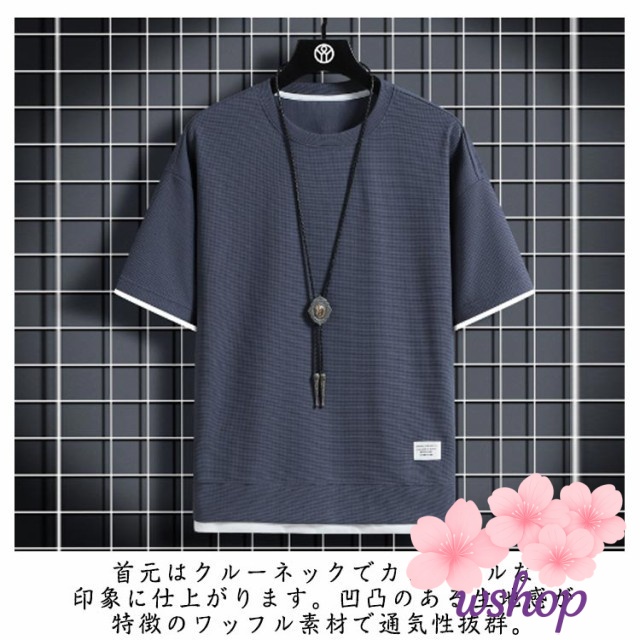 メンズ ワッフル生地 ゴルフウェア 通気性 カジュアル ワッフルTシャツ 送料無料 Tシャツ 夏服 半袖Tシャツ 通気性 お洒落 クルーネック カットソー 五分袖 半袖 重ね着風 涼しい tシャツ インナー ルームウェア パジャマ おしゃれ