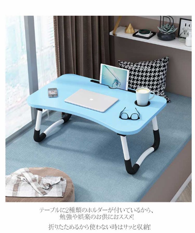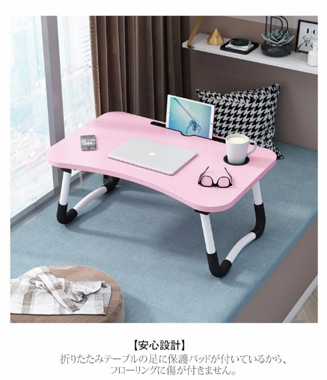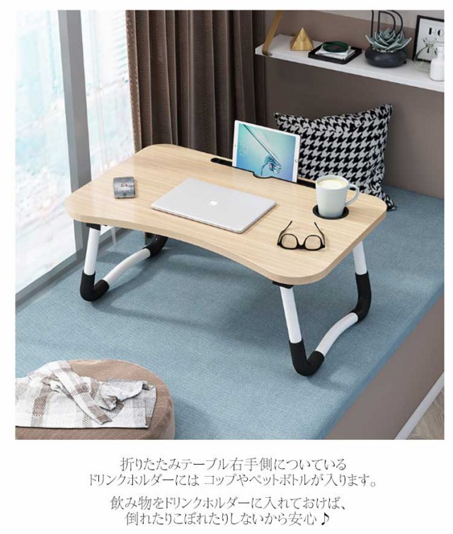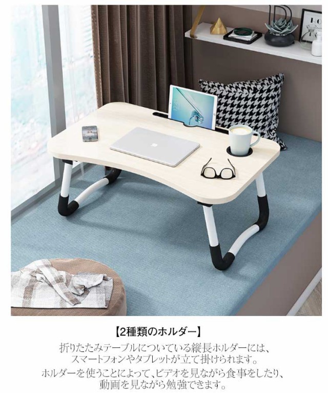 | ベッドや床の上にパッと置ける!ホルダー付き一人用折りたたみテーブル 折りたためるから使わない時はサッと収納! テーブルに2種類のホルダーが付いているから、勉強や娯楽のお供におススメ! 【2種類のホルダー】 折りたたみテーブルについている縦長ホルダーには、 スマートフォンやタブレットが立て掛けられます。 ホルダーを使うことによって、ビデオを見ながら食事をしたり、動画を見ながら勉強できます。 折りたたみテーブル右手側についているドリンクホルダーには コップやペットボトルが入ります。 飲み物をドリンクホルダーに入れておけば、 倒れたりこぼれたりしないから安心♪ 【安心設計】 折りたたみテーブルの足に保護パッドが付いているから、フローリングに傷が付きません。 滑り止め効果もあるので、使用中にズレる心配もありません。 テーブルの天板は全体的に丸みを帯びている角丸加工なので、ぶつかっても怪我しにくい! 【隙間収納】 折りたたみテーブルを使わないときは、足を畳んでコンパクトに収納! ベッドの下、壁や棚の隙間などにサッと入ります。 【体にフィット】 折りたたみテーブルの天板はお腹に合わせた曲線設計なので、いろんな座位にピッタリ♪ あぐらや正座で座っても疲れにくい! 【様々な場面に使える】 在宅勤務用の机、タブレットを使って動画鑑賞、アウトドア用の持ち運び机、 飲み物を持ち込んで勉強…等々、折りたたみテーブルの使い方は色々! | |